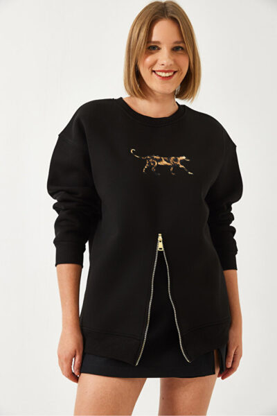 BiancoLucci Kadin Uc Iplik Sardonlu Onu Fermuarli Leopar Baskili Sweatshirt 60351258