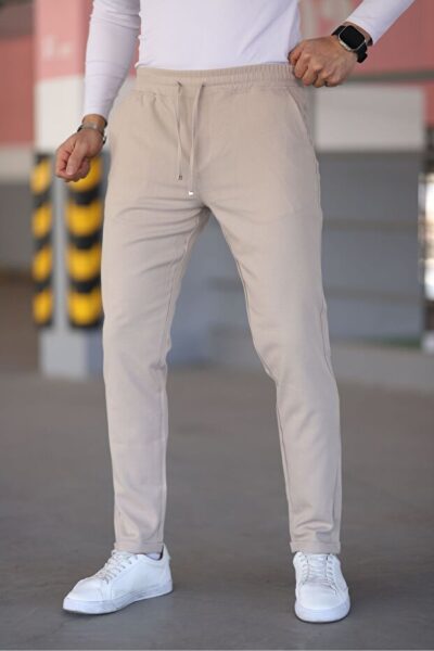 Burke Erkek Krem Renk Beli Lastikli Bagcikli Esnek Fitted Jogger Pantolon Kumas Pantolon