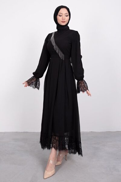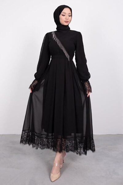 LamiaGiyim Capraz Zincir Detayli Asimetrik Tesettur Abiye Siyah