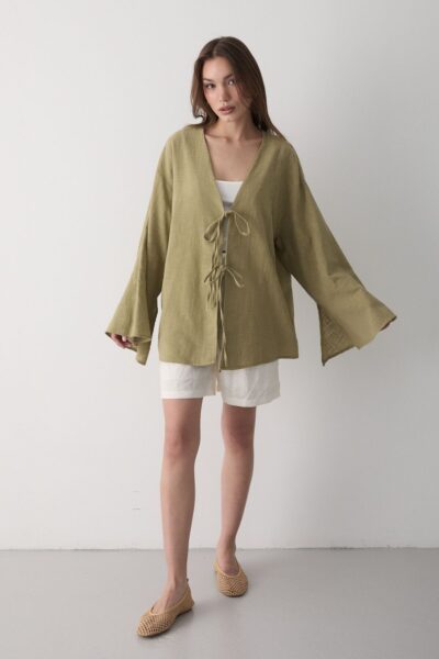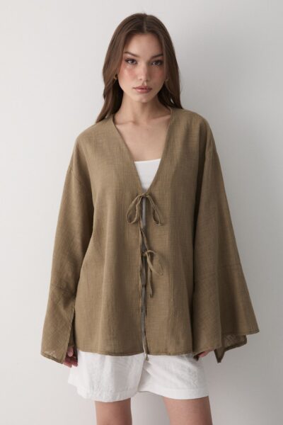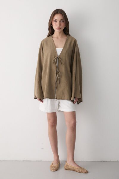 JASTE Kadın Haki Çift Bağlama Keten Kimono