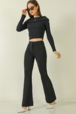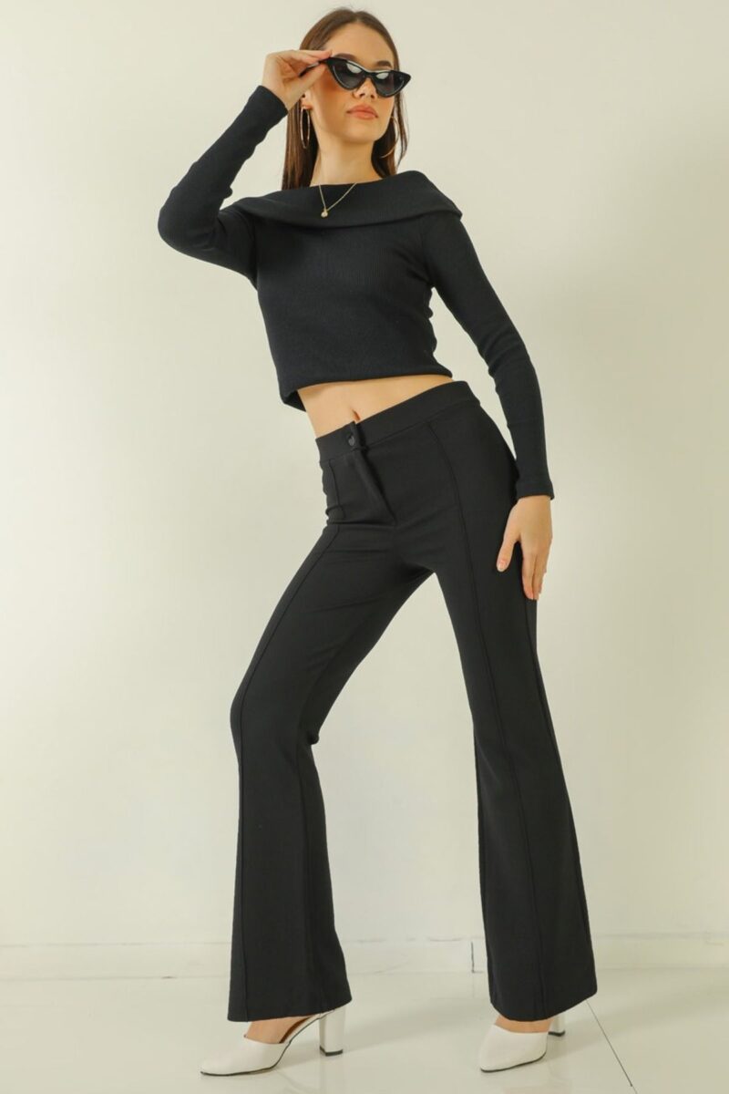 AREF JEANS Kadın Siyah Yüksek Bel Toparlayıcı Ispanyol Paça Palazzo Pantolon