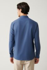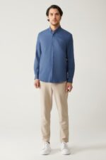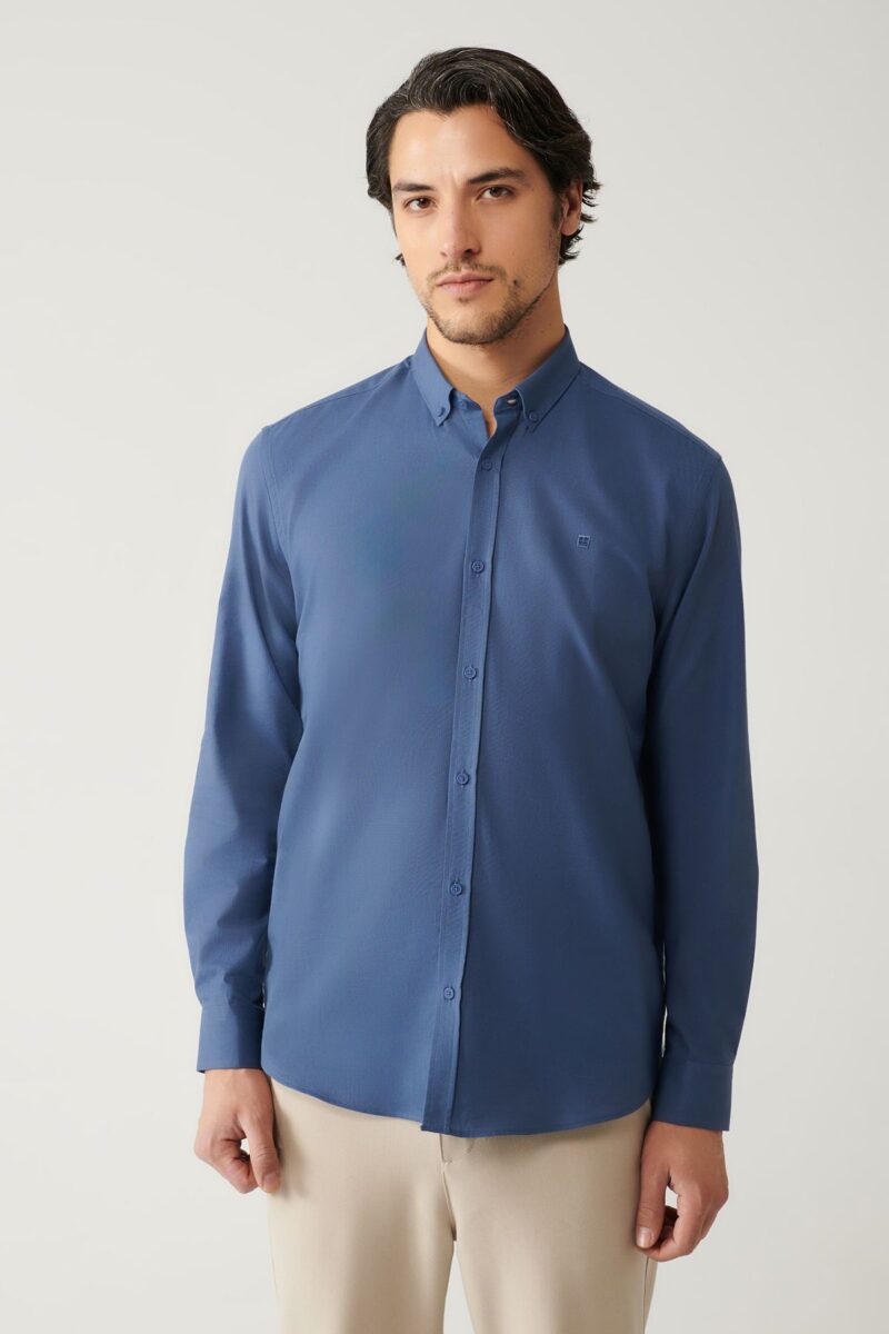 🛍 Avva Erkek Indigo Düğmeli Yaka %100 Pamuk Keten Dokulu Gömlek E002141