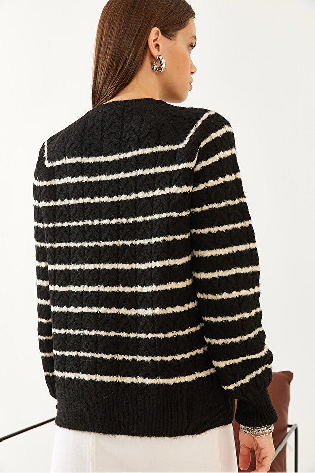 BiancoLucci Kadin Dugme Detayli Sac Orgulu Cizgili Triko Kazak 85001008