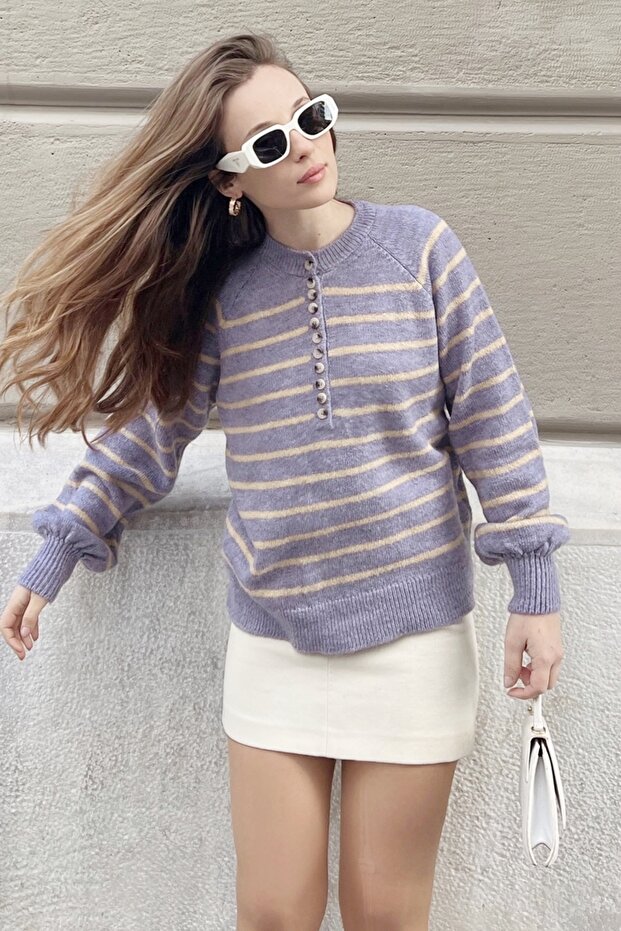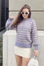 BiancoLucci Kadin Yakasi Ilikli Balikci Yaka Cizgili Triko Kazak