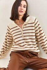BiancoLucci Kadin Yakasi Ilikli Balikci Yaka Cizgili Triko Kazak