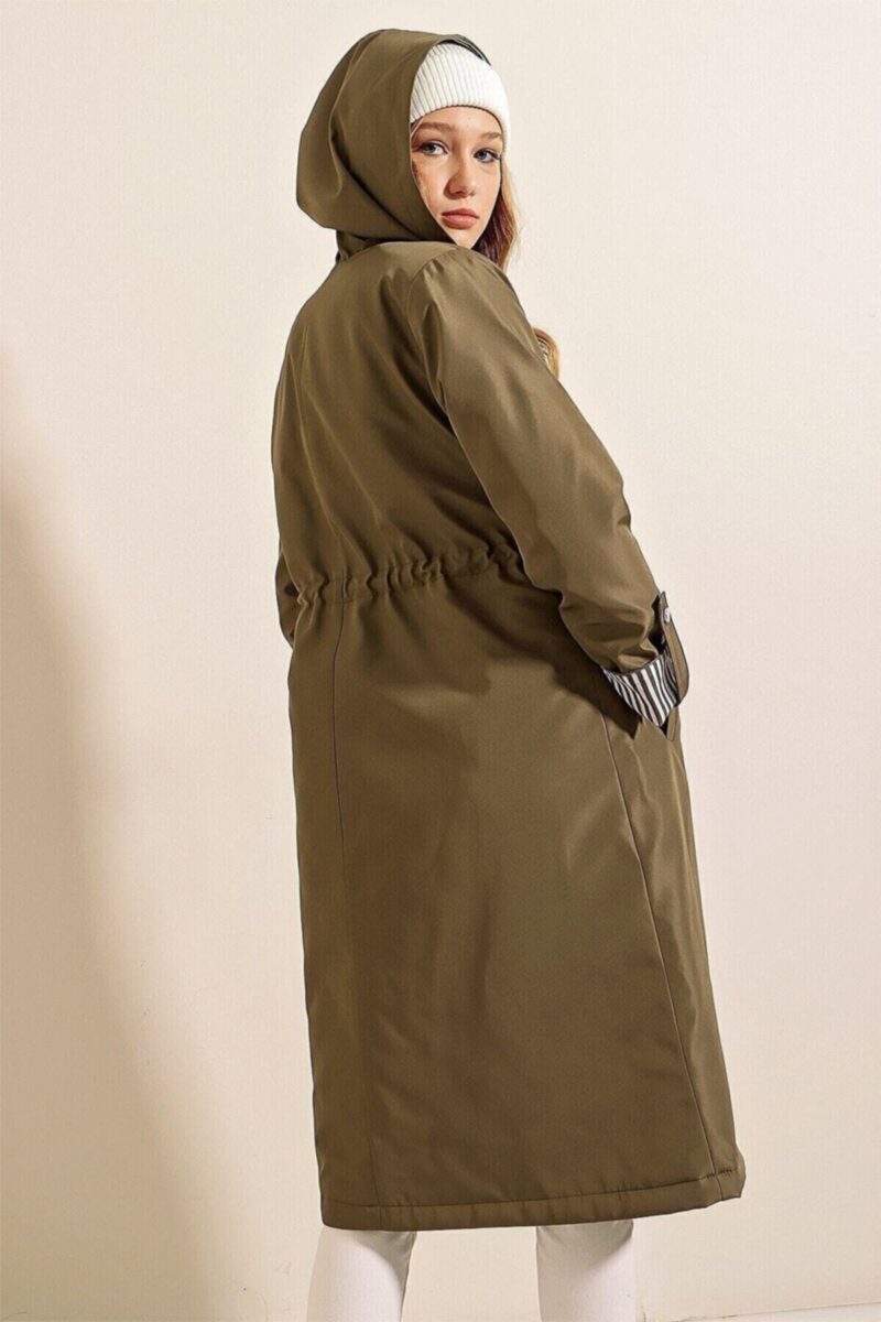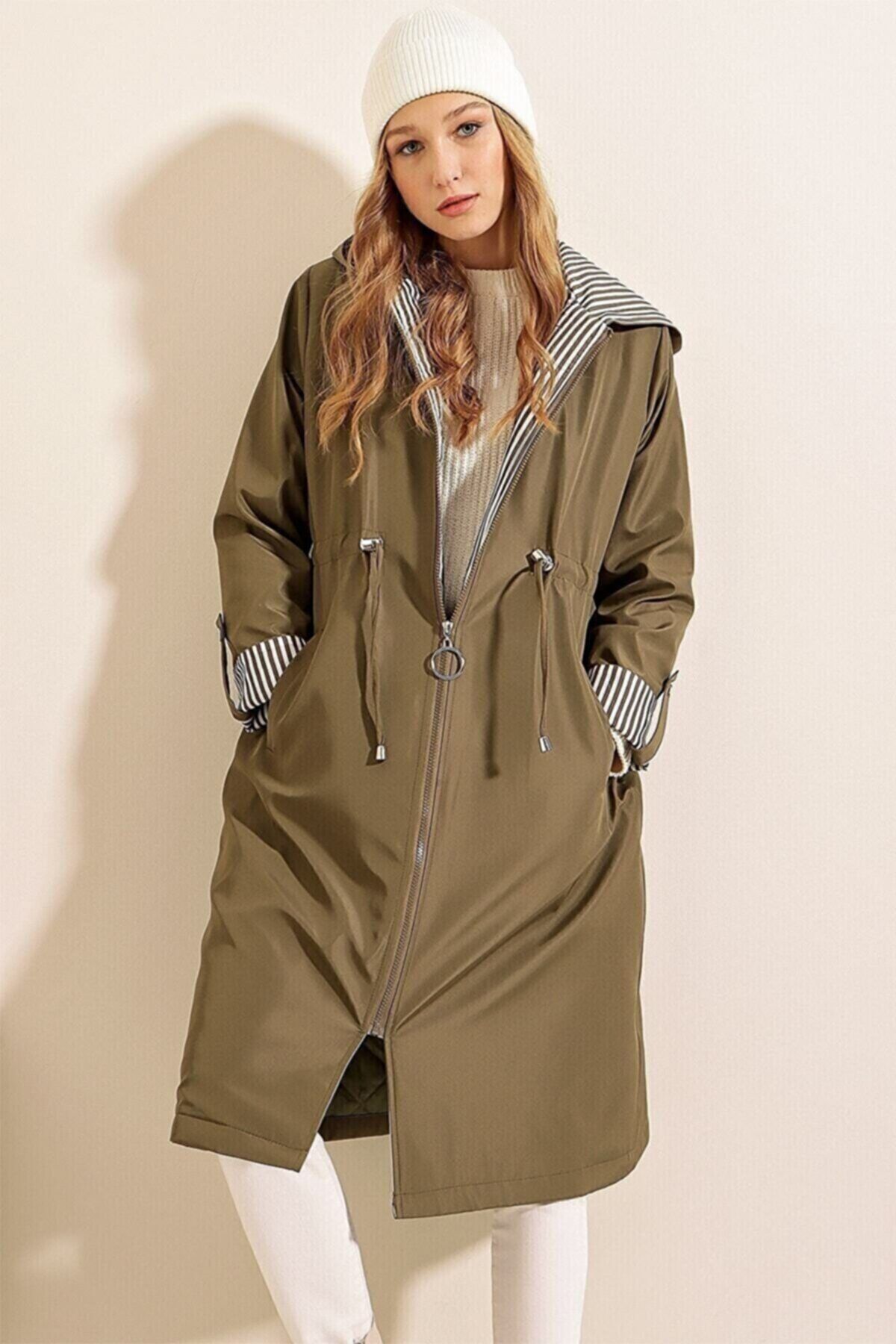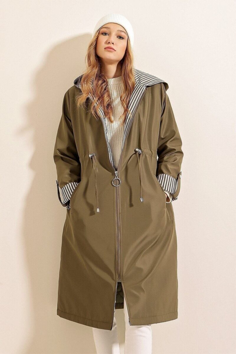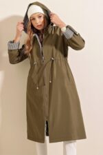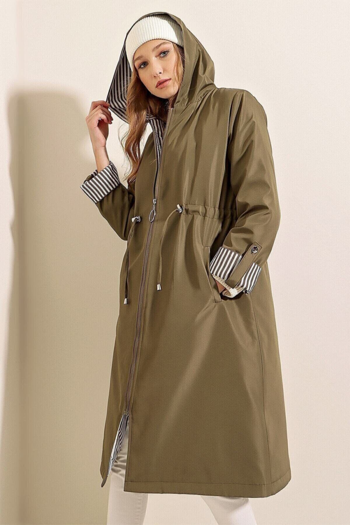 🛍 Bigdart Kadın Haki Beli Büzgülü Kapşonlu Uzun Trençkot
