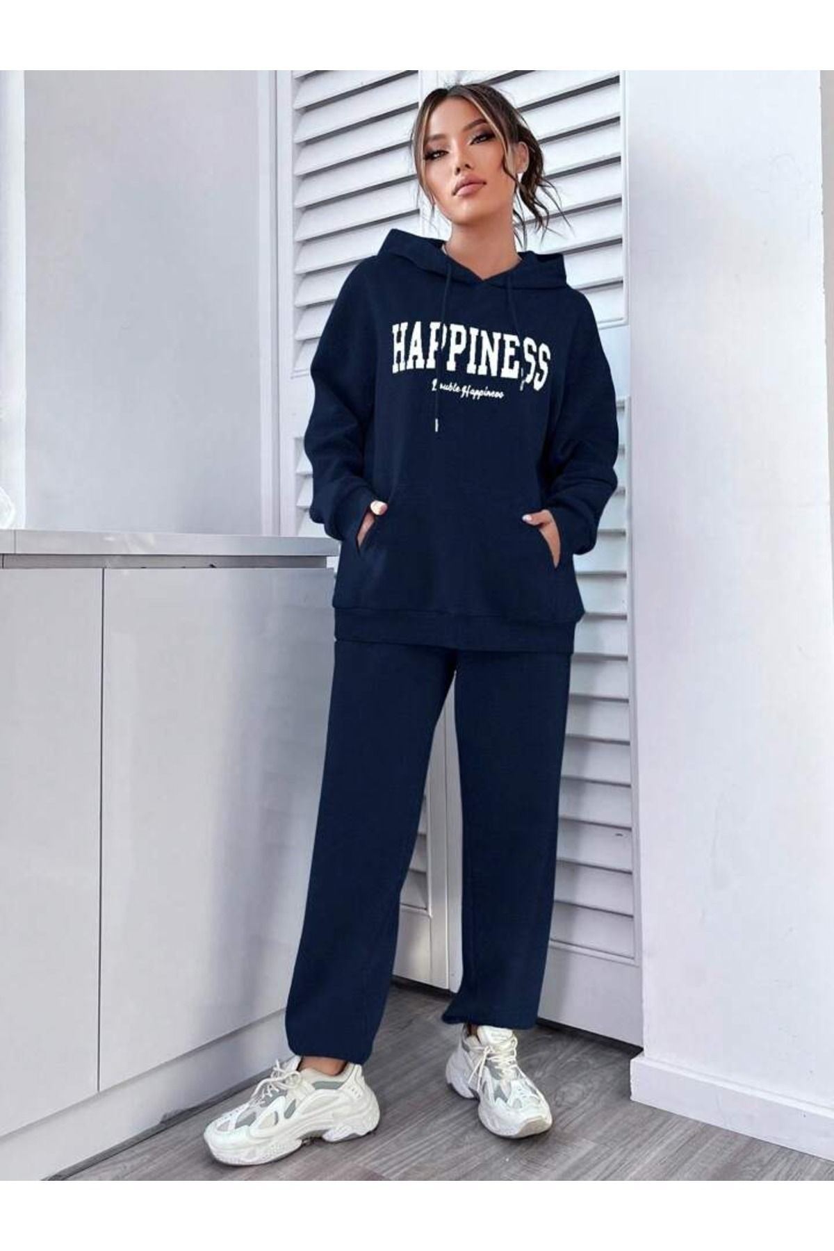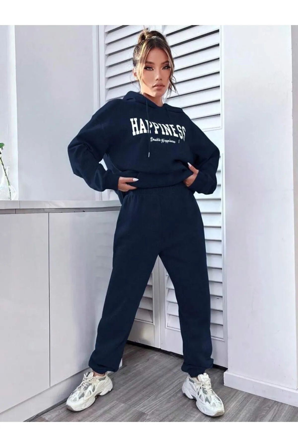 DubuButik Happiness Esofman Takimi Sweatshirt Jogger Lacivert Baskili Oversize Sardonlu Kapusonlu