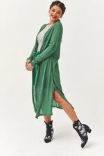 Ebsumu Kadın Ince Triko Uzun Koyu Yeşil Hırka