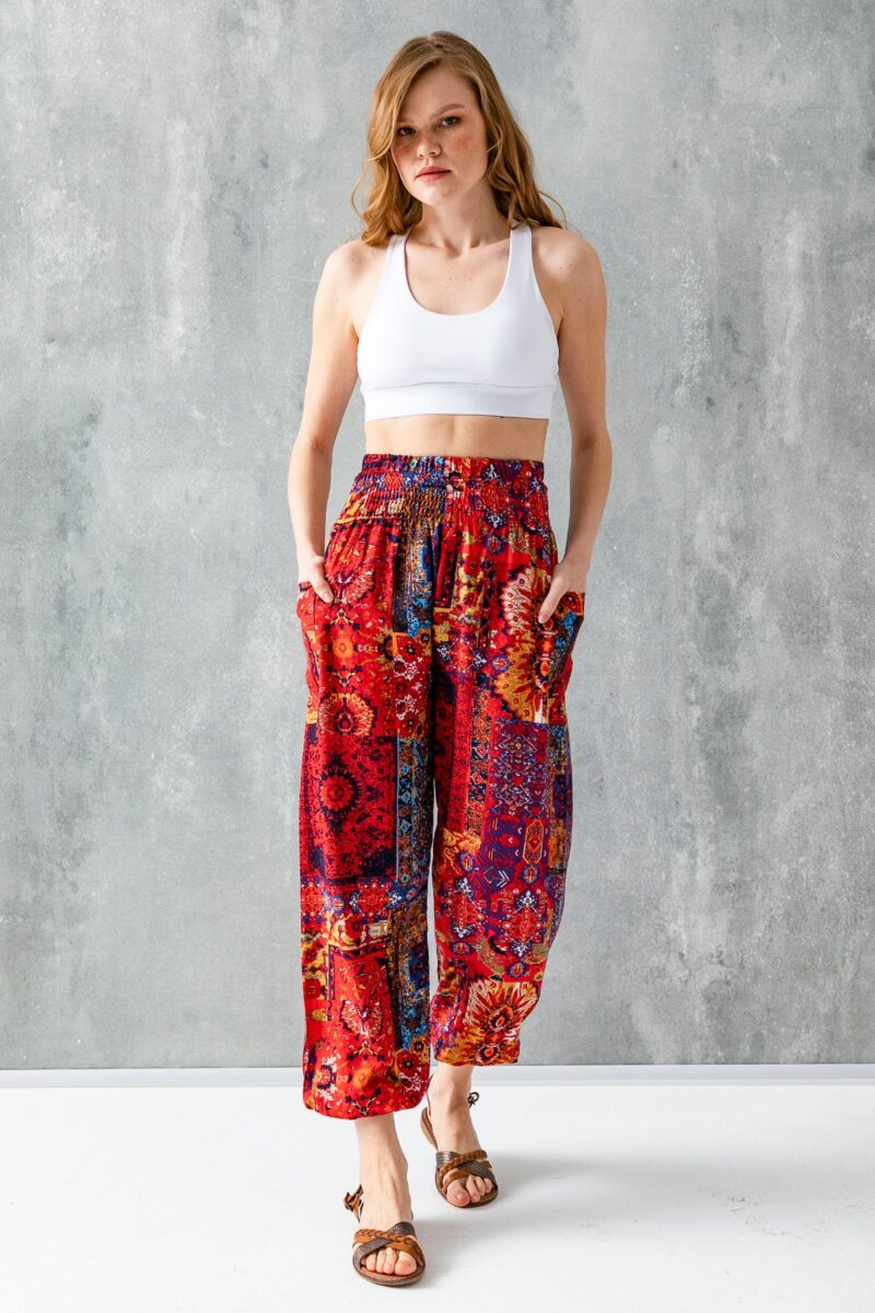 GİYSA Kırmızı Etnik Desenli Kadın Şalvar Yoga Pantolonu %100 Viskon Çift Cepli – 2460