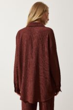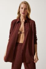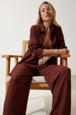 🛍 Happiness İstanbul Kadın Kahverengi Rahat Örme Gömlek Pantolon Takım KH00090