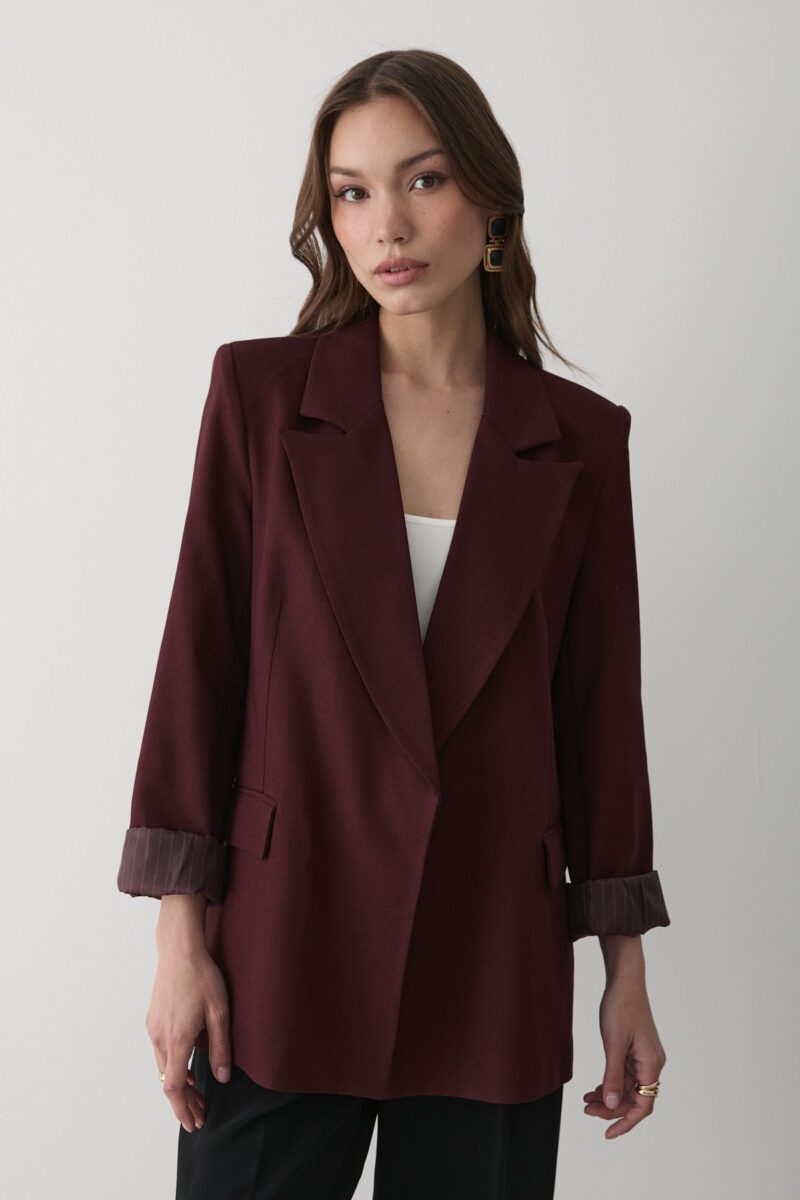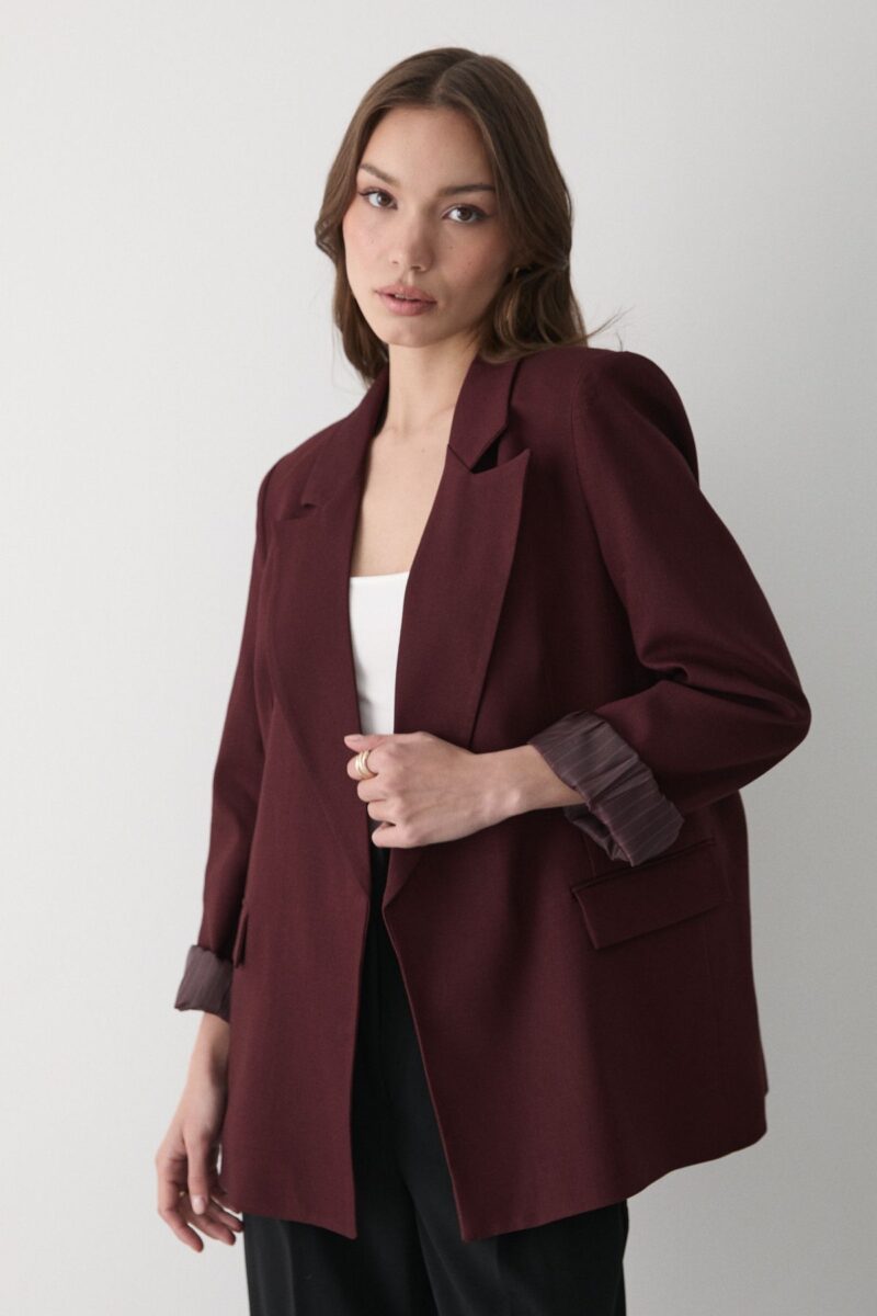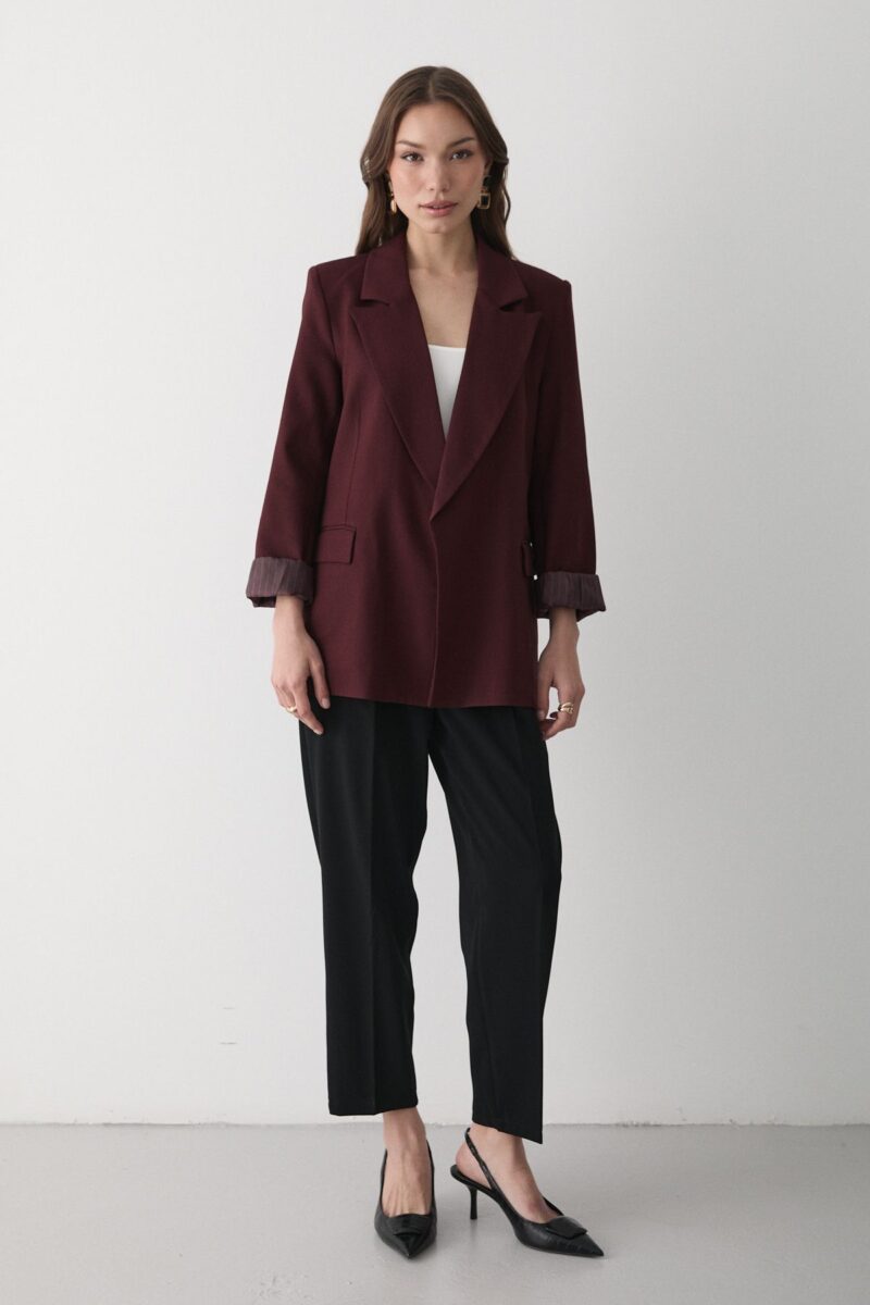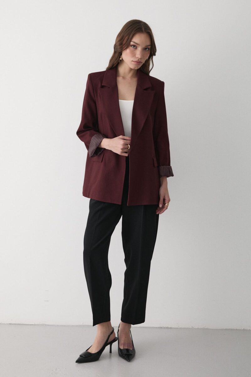 🛍 JASTE Kadın Bordo Çizgili Içi Astarlı Kol Detaylı Blazer Ceket