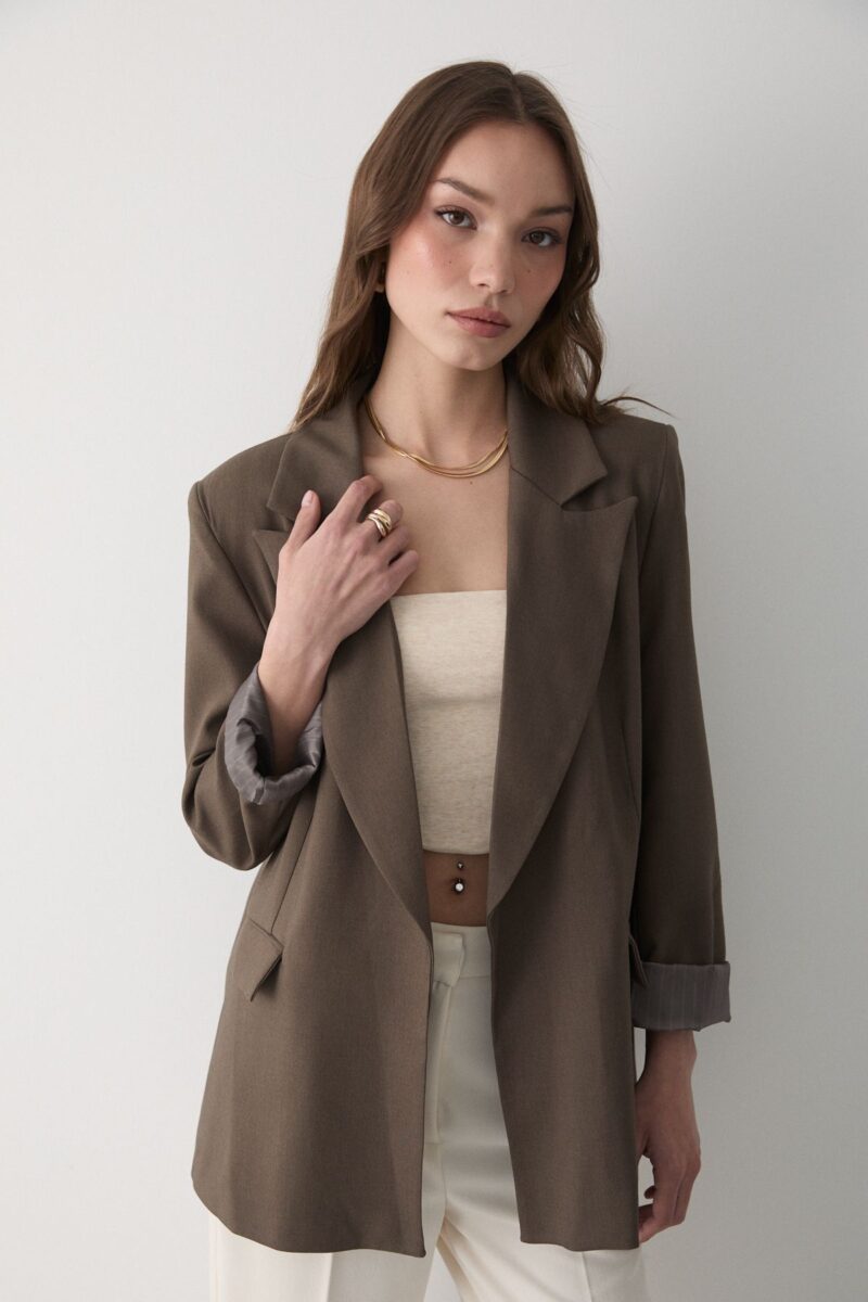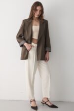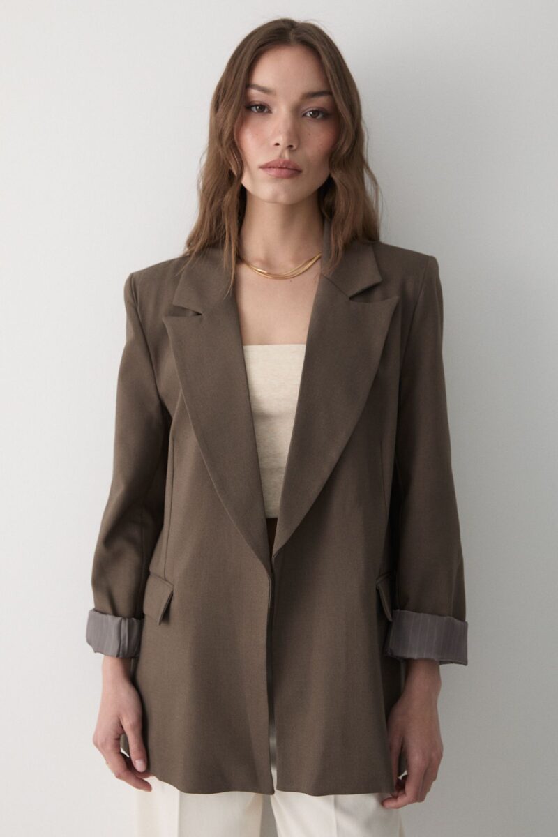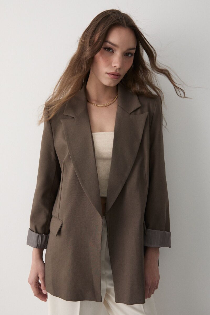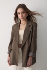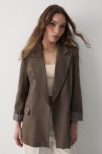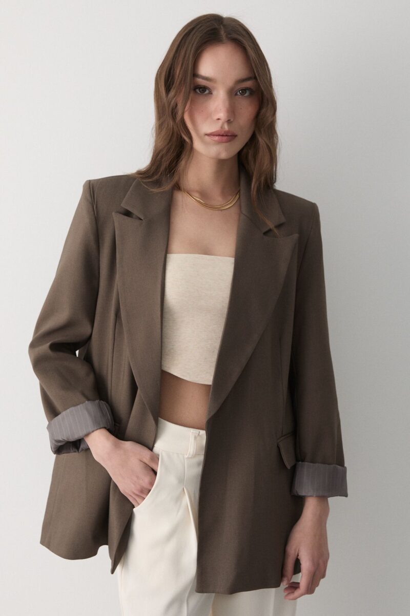 JASTE Kadın Kahve Çizgili İçi Astarlı Kol Detaylı Blazer Ceket