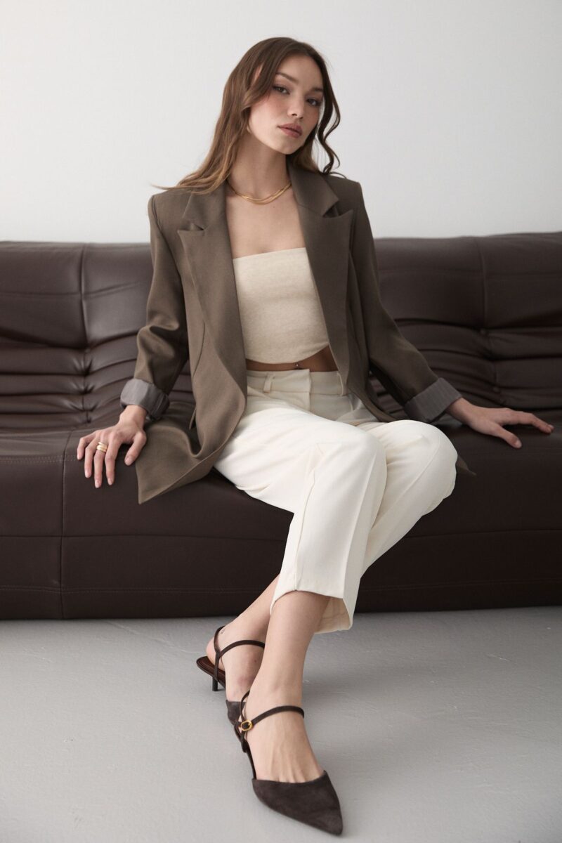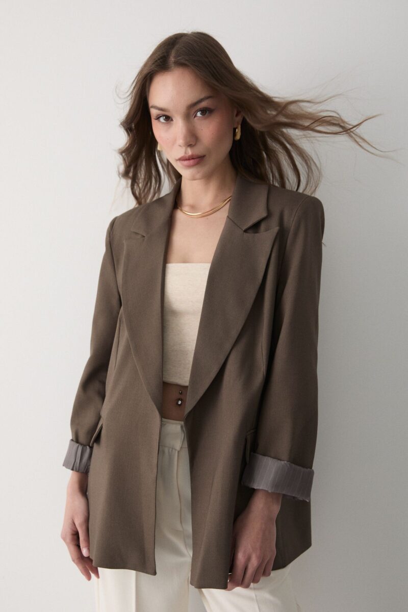 🛍 JASTE Kadın Kahve Çizgili İçi Astarlı Kol Detaylı Blazer Ceket