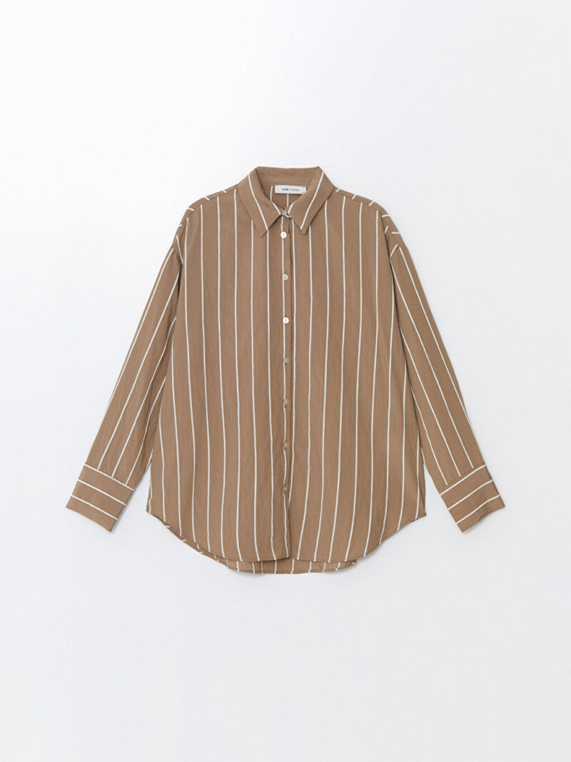 🛍 LCW Vision Kahverengi Çizgili Uzun Kollu Oversize Kadın Gömlek