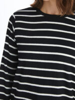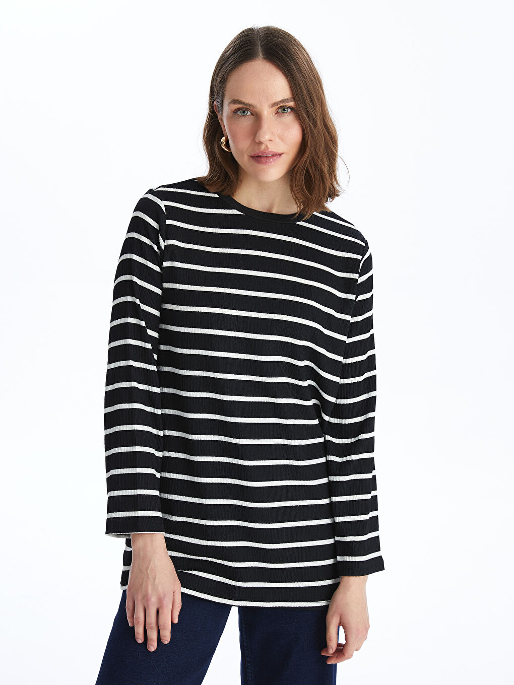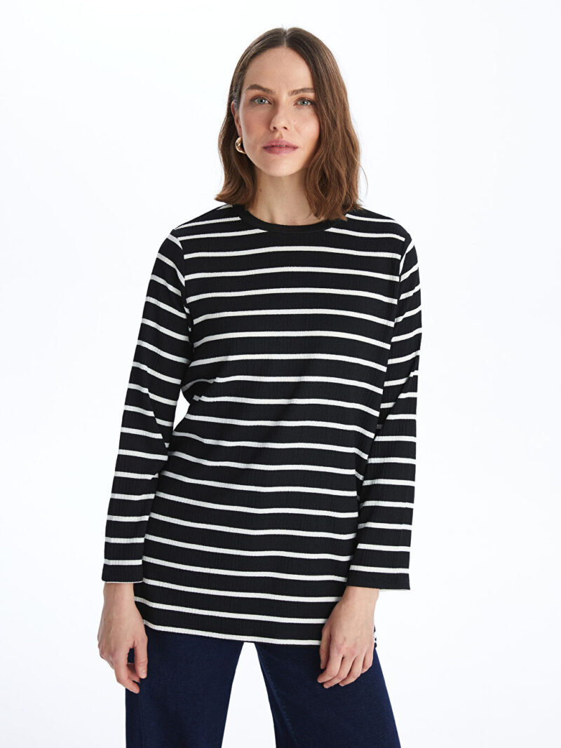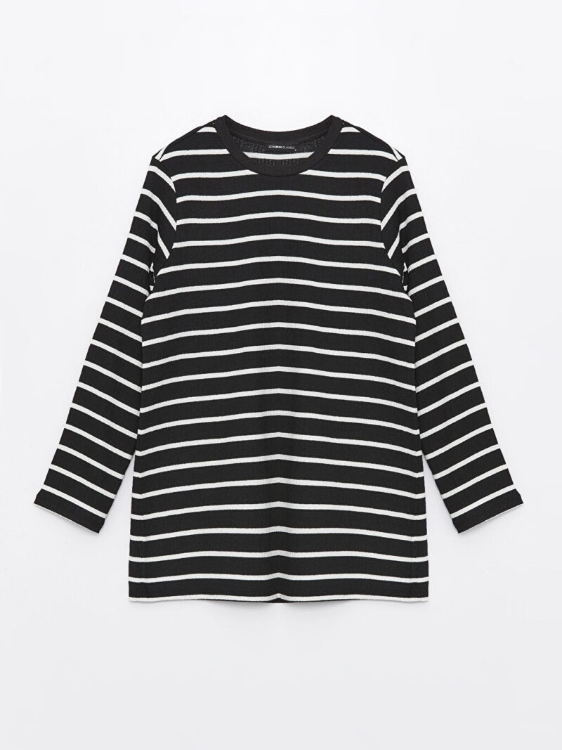 🛍 LCWAIKIKI Basic Siyah Bisiklet Yaka Çizgili Uzun Kollu Oversize Kadın Tunik