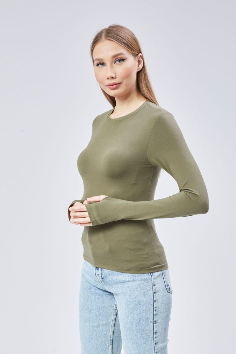 🛍 Maison La Femme Haki Bisiklet Yaka Basic Uzun Kollu Parmak Geçirme Detaylı Body