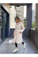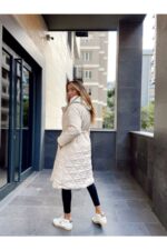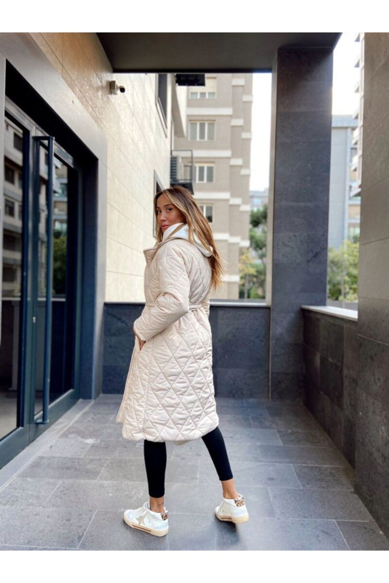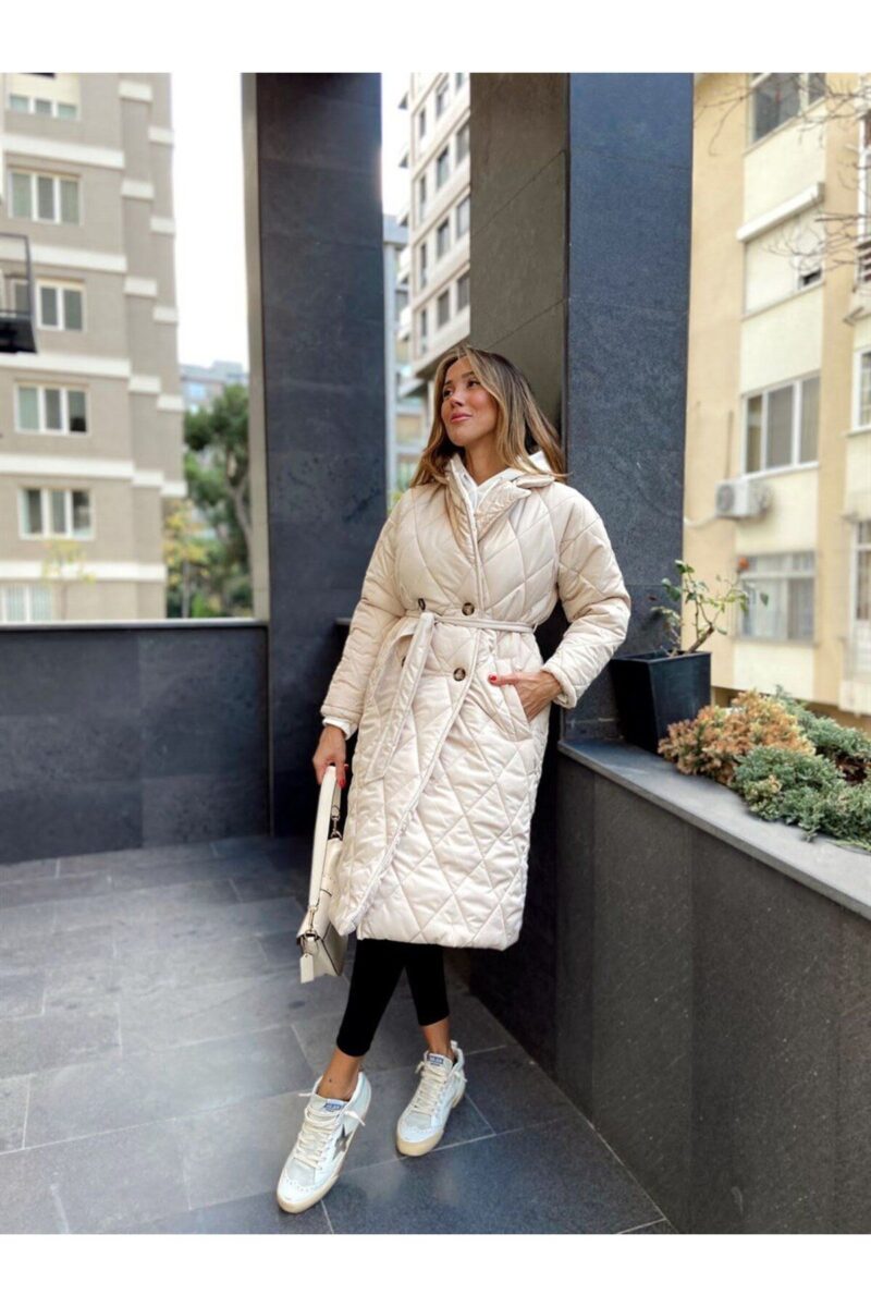 🛍 MALDİA SHOP Kadın Uzun Kuşaklı Kapitone Krem Kaban