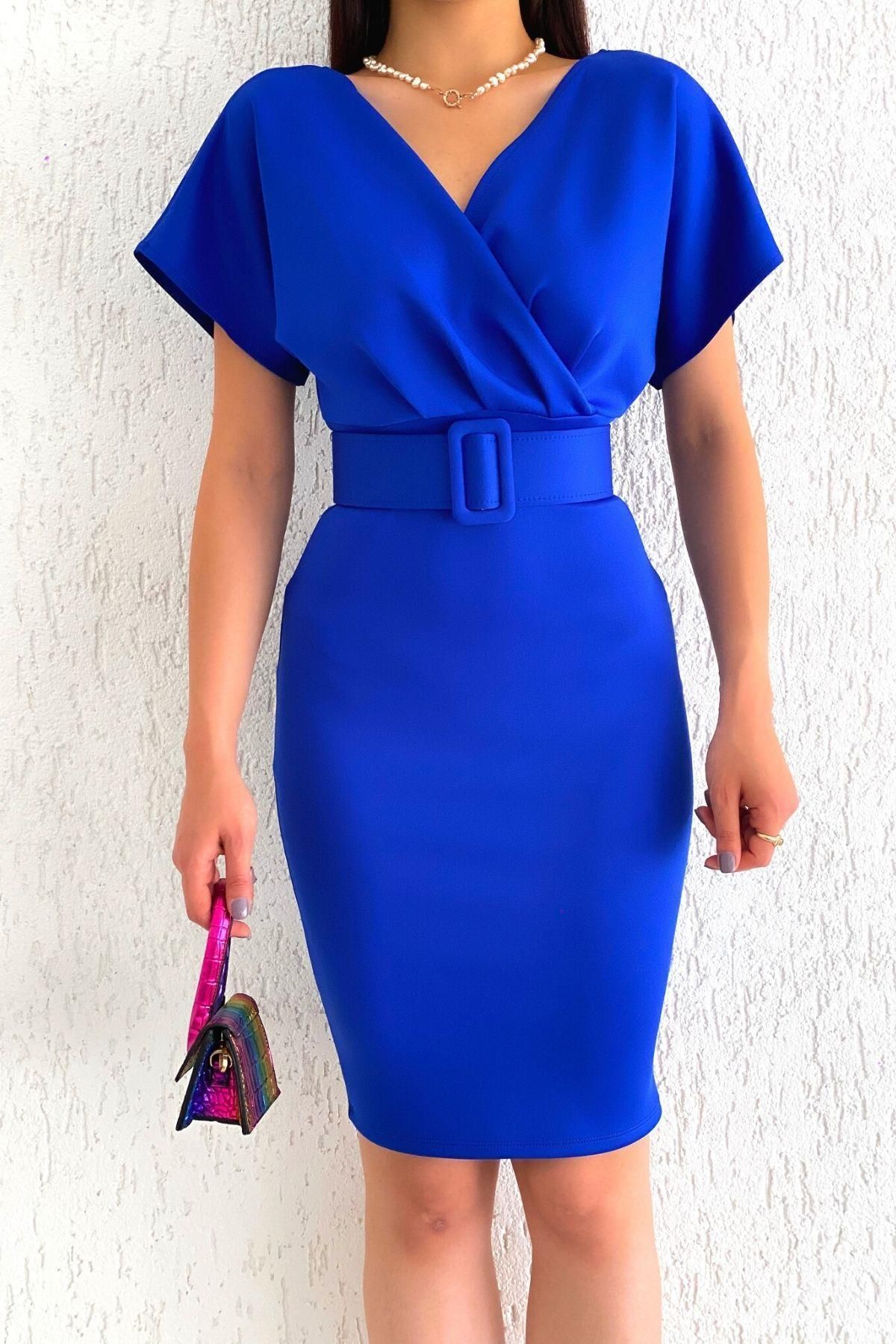 🛍 Mossta Kruvaze Yaka Kemerli Likralı Elbise Saks