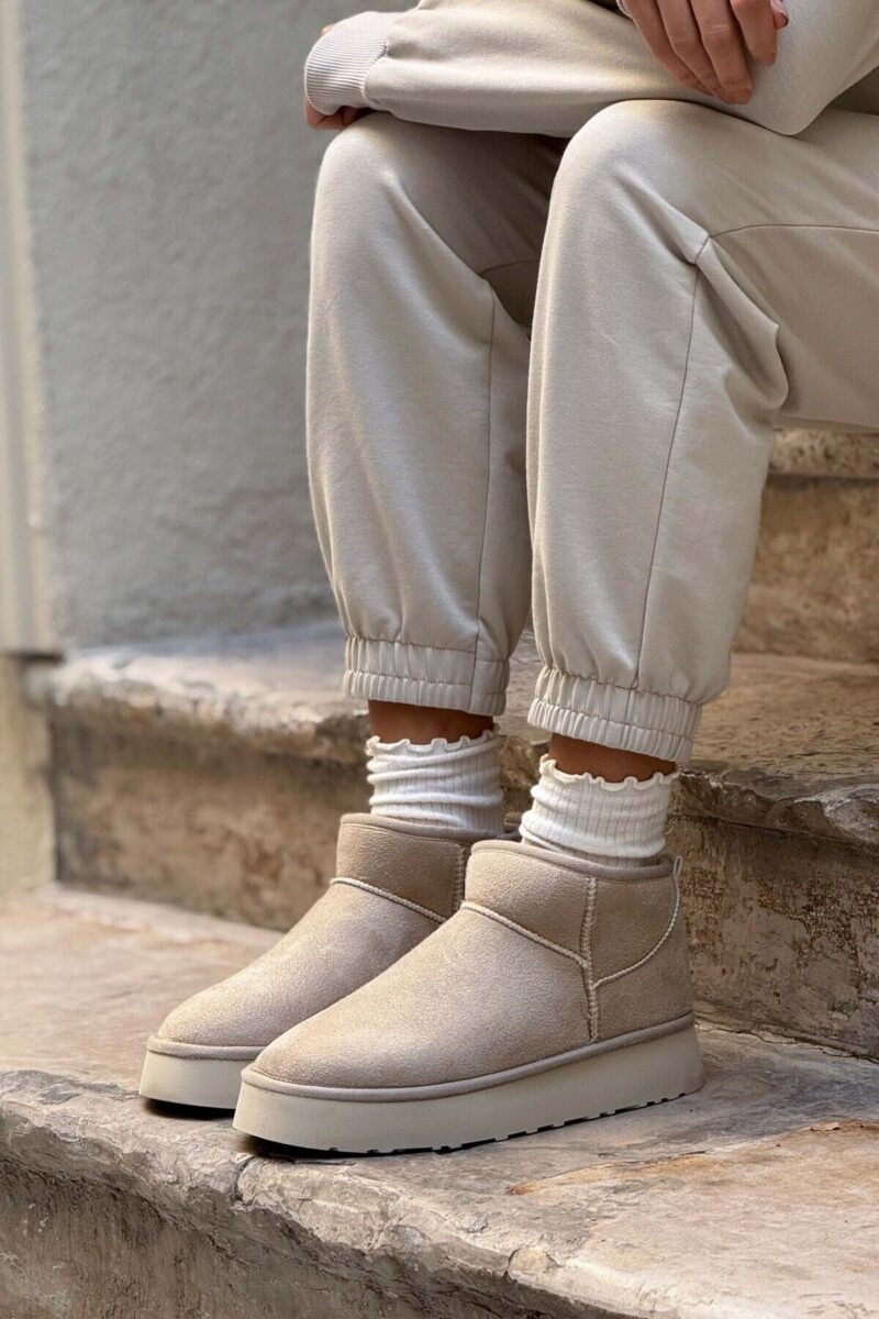 🛍 NİŞANTAŞI SHOES Mini Kum Beji Süet İçi Kürklü Kalın Taban Kadın Bot