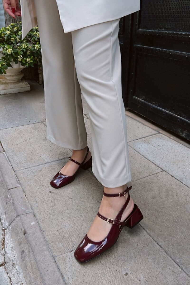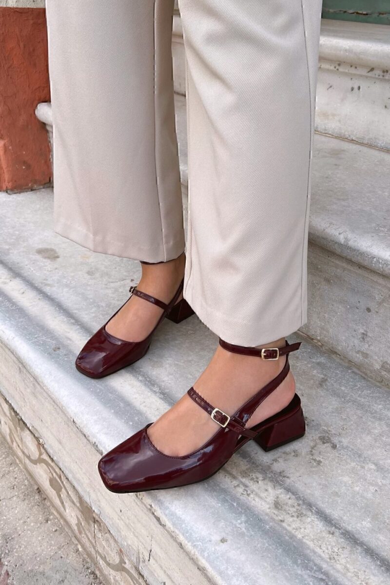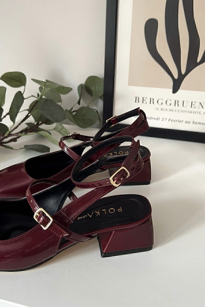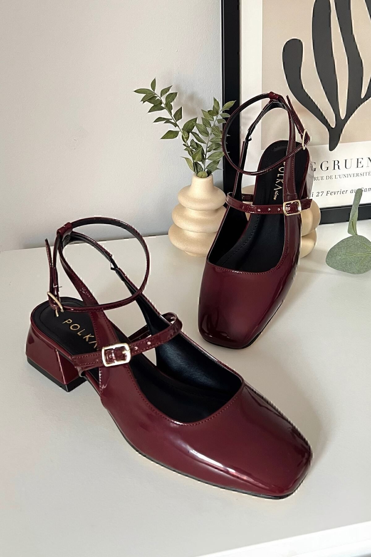 POLKA STORE Kadın Mary Jane Bordo Rugan Arkası Açık Kare Burunlu Baretli Kısa Blok Topuklu Ayakkabı Cherry Red