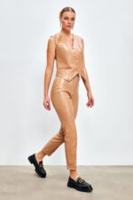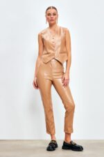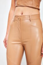 🛍 Sateen Dikiş Detaylı Deri Pantolon – BEJ