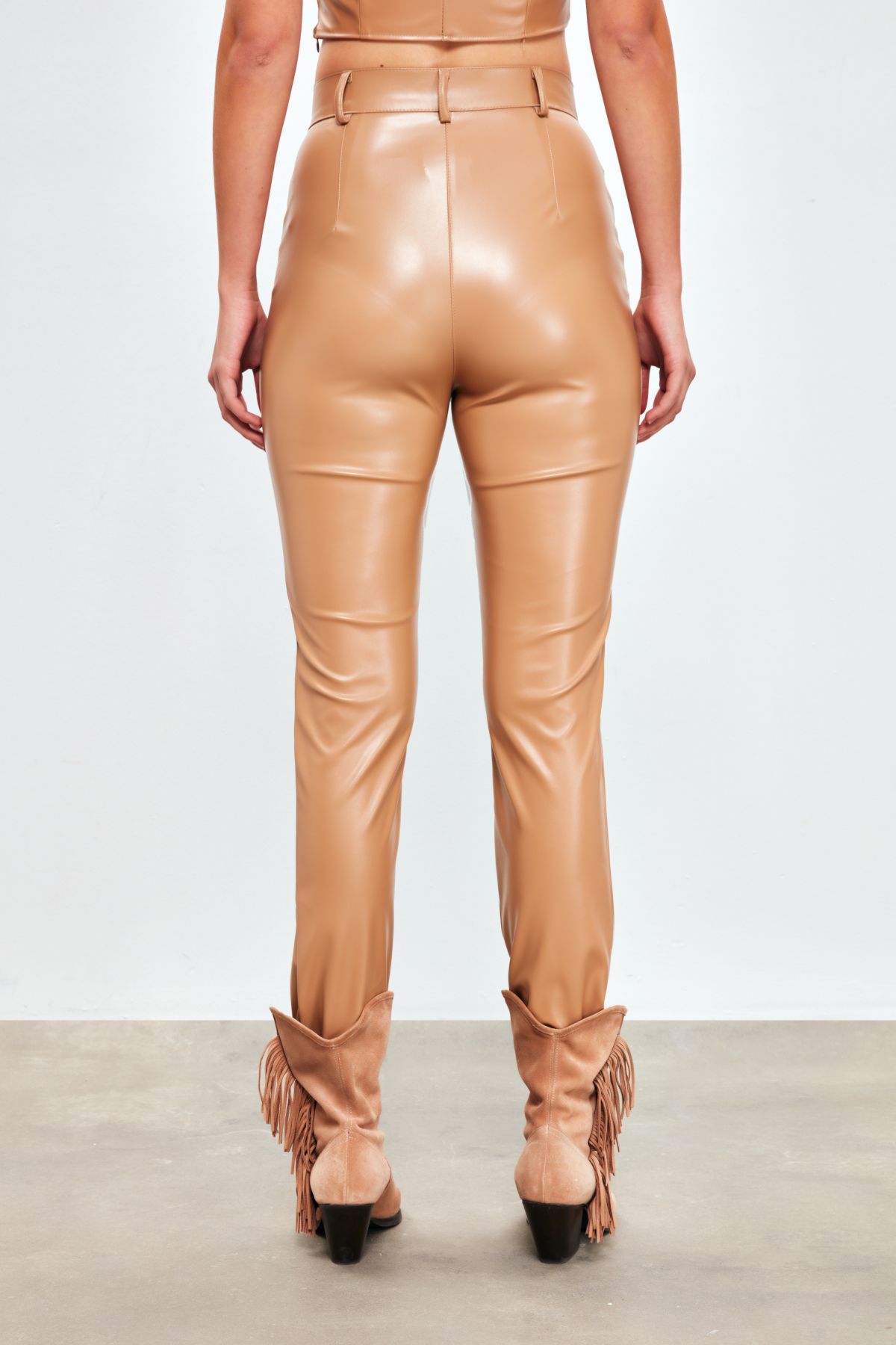 Sateen Dikiş Detaylı Deri Pantolon – BEJ