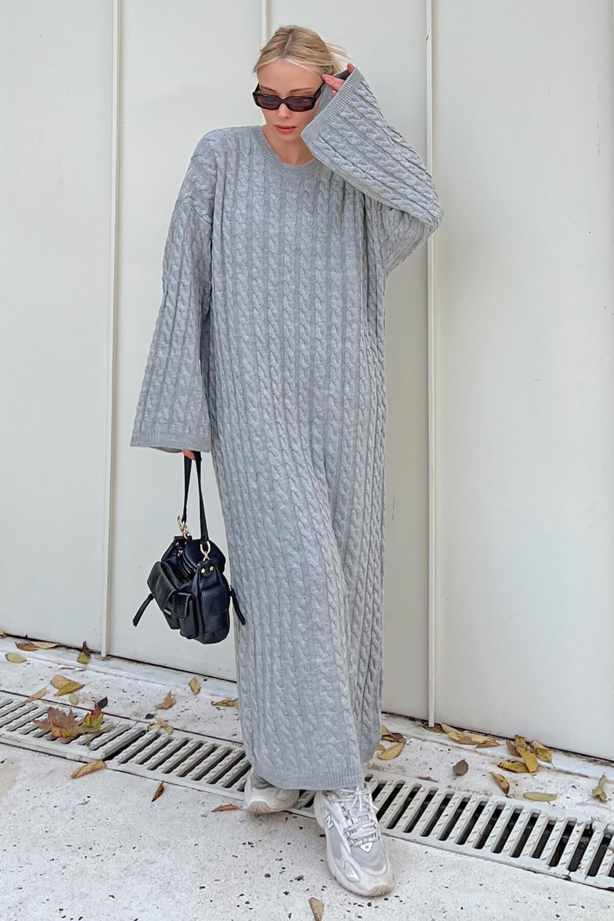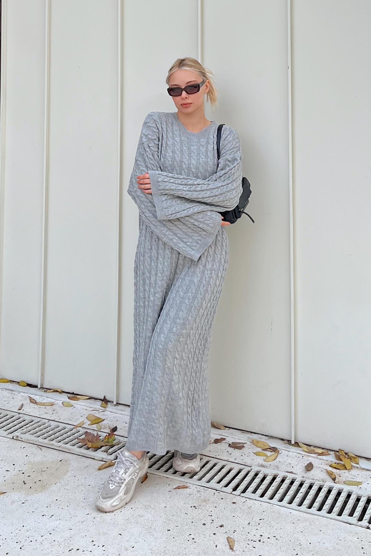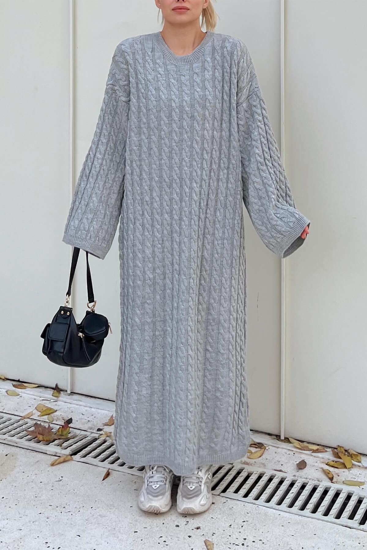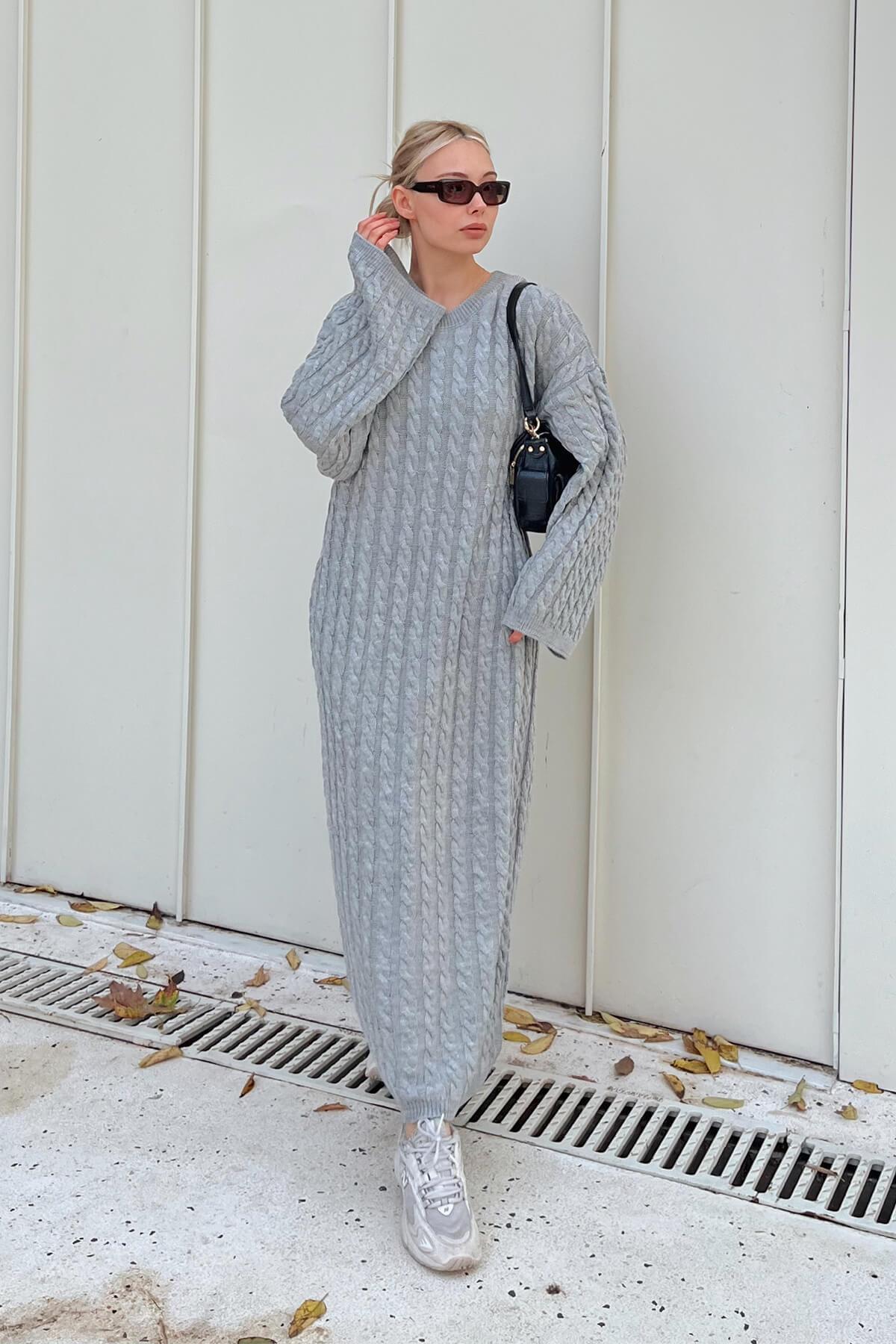 Swist Gri Bisiklet Yaka Sac Orgulu Kadin Triko Midi Elbise