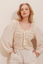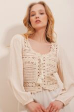🛍 Trend Alaçatı Stili Kadın Bej Kare Yaka Önü Bağlamalı Kroşata Dokuma Crop Bluz ALC-X10028