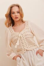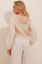 Trend Alaçatı Stili Kadın Bej Kare Yaka Önü Bağlamalı Kroşata Dokuma Crop Bluz ALC-X10028
