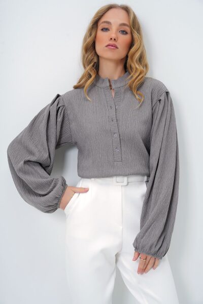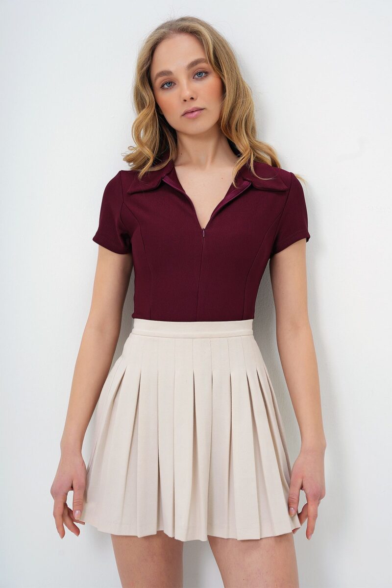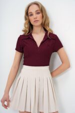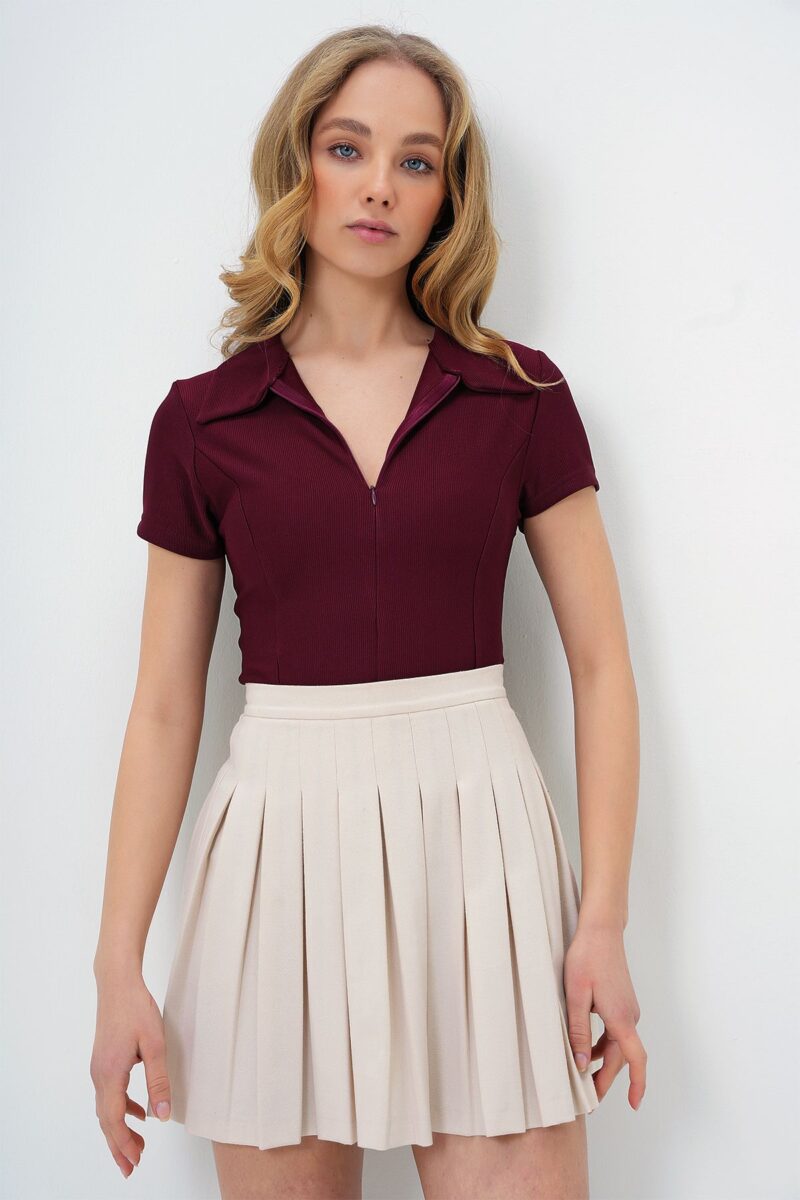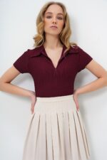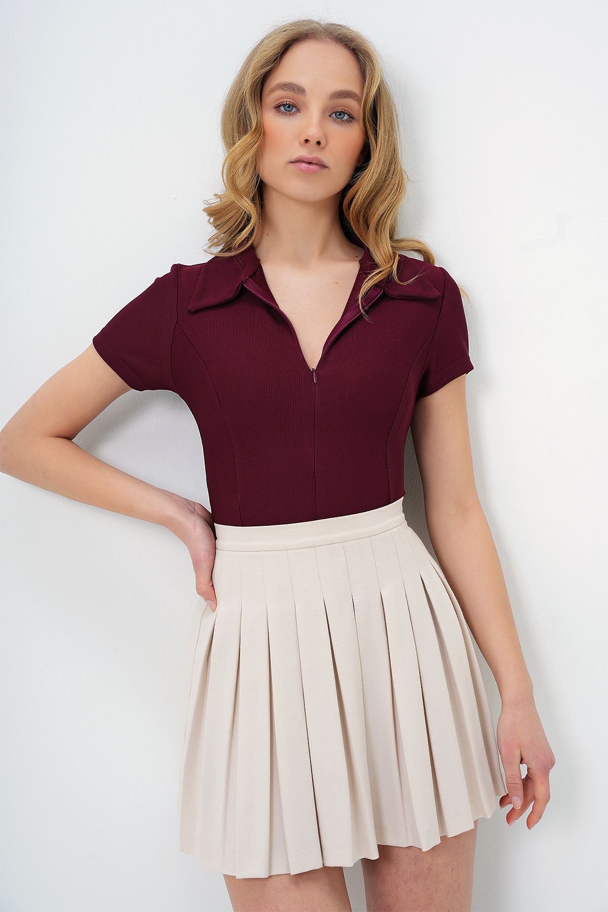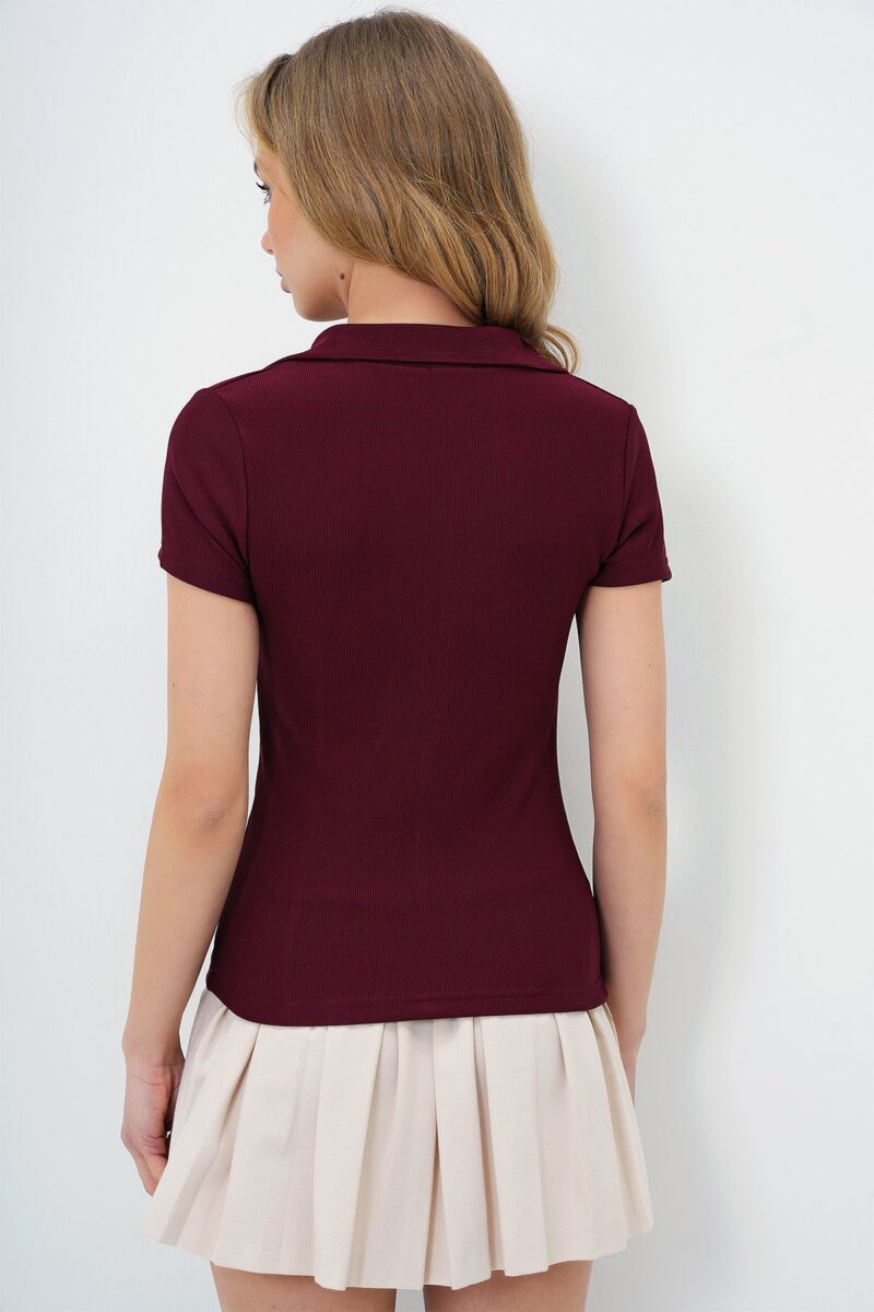 🛍 Trend Alaçatı Stili Kadın Bordo Gömlek Yaka Gizli Fermuarlı Ottoban Bluz ALC-X13712