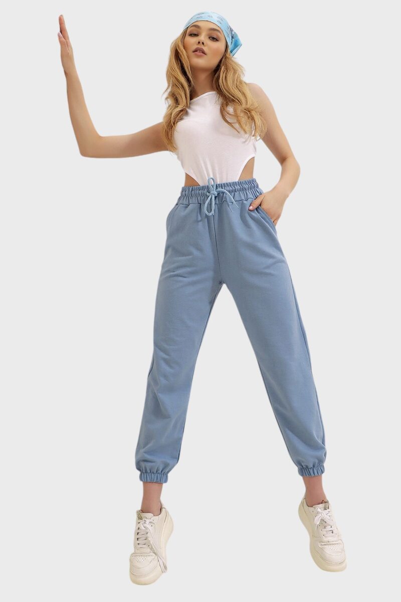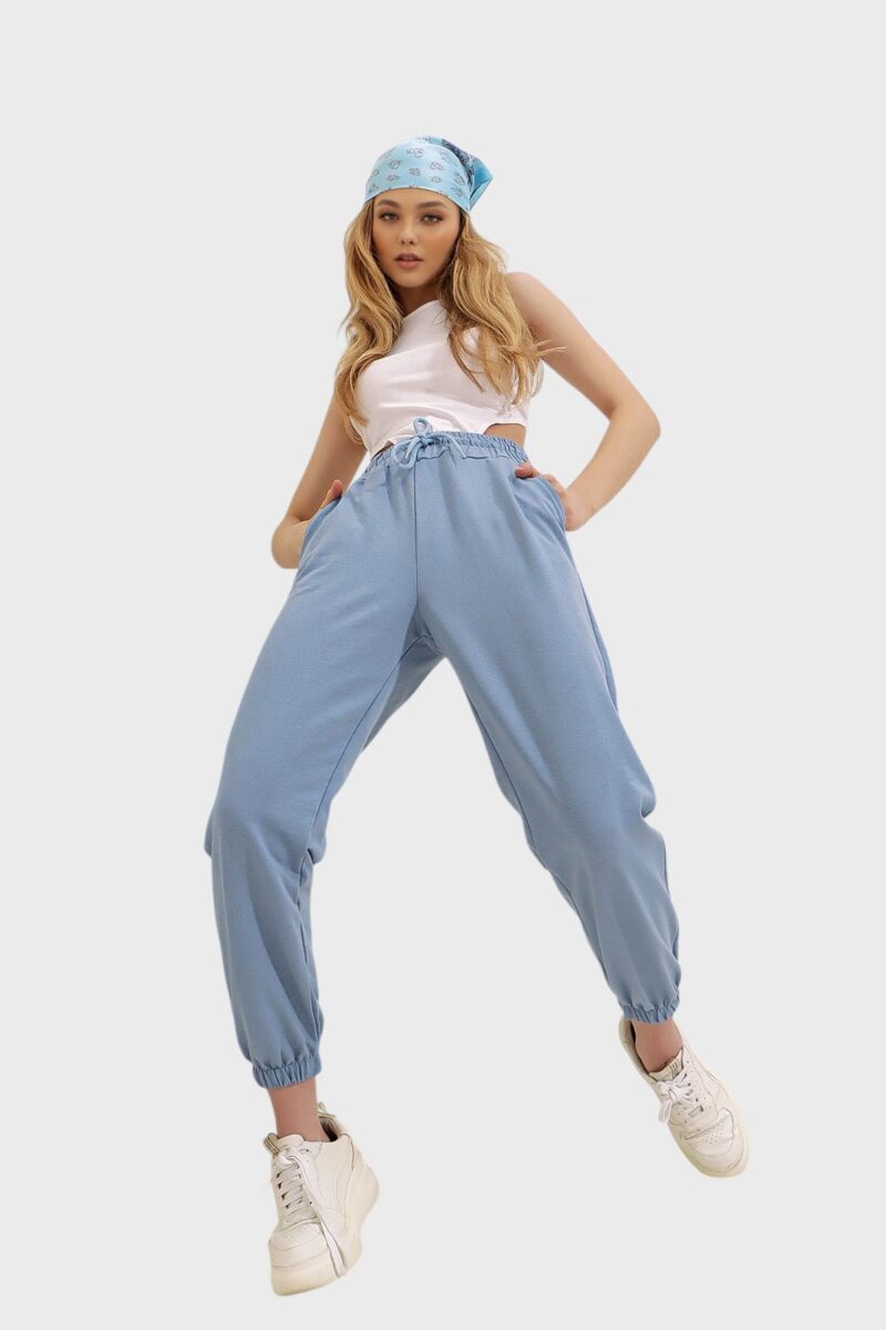 Trend Alaçatı Stili Kadın Gök Mavisi Mevsimlik Paçası Lastikli İki İplik Eşofman Altı ALC-Y2933