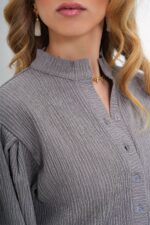 🛍 Trend Alaçatı Stili Kadın Gri Hakim Yaka Önü Düğmeli Balon Kol Dokulu Bürümcük Gömlek Bluz ALC-X11872
