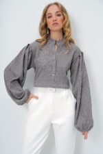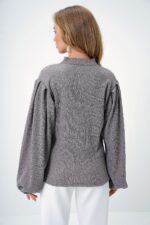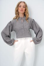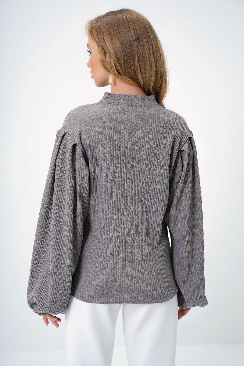 Trend Alaçatı Stili Kadın Gri Hakim Yaka Önü Düğmeli Balon Kol Dokulu Bürümcük Gömlek Bluz ALC-X11872