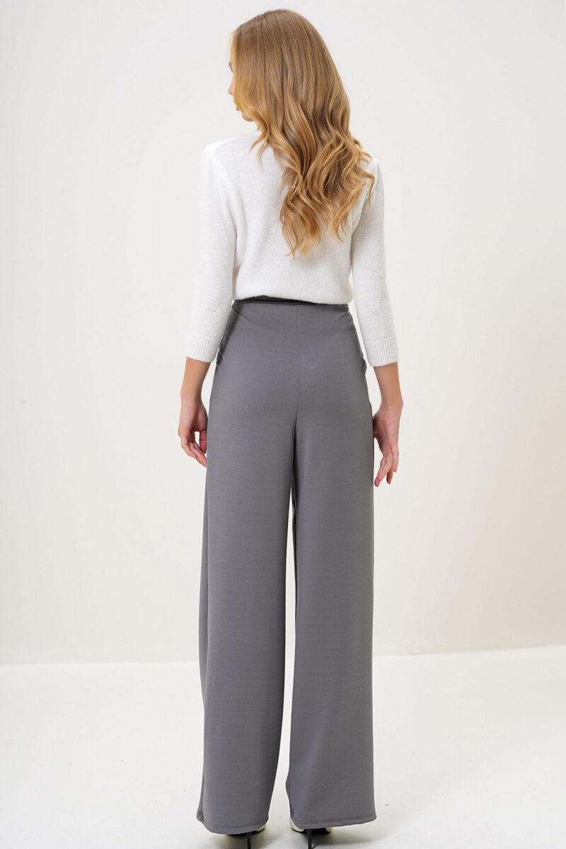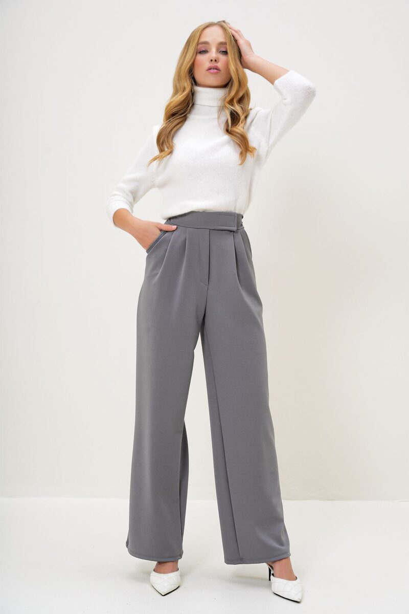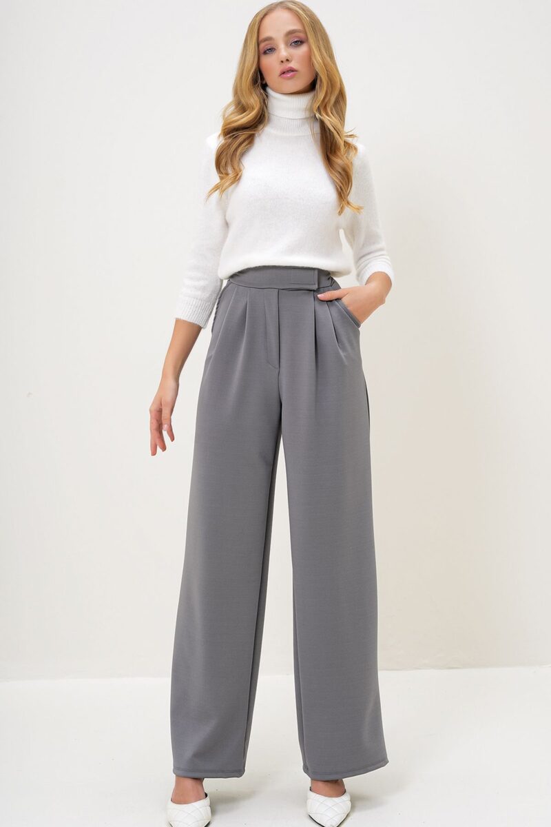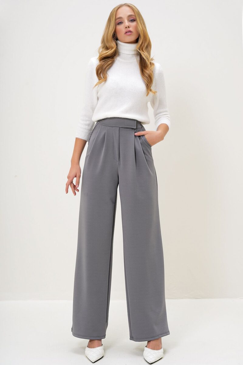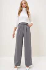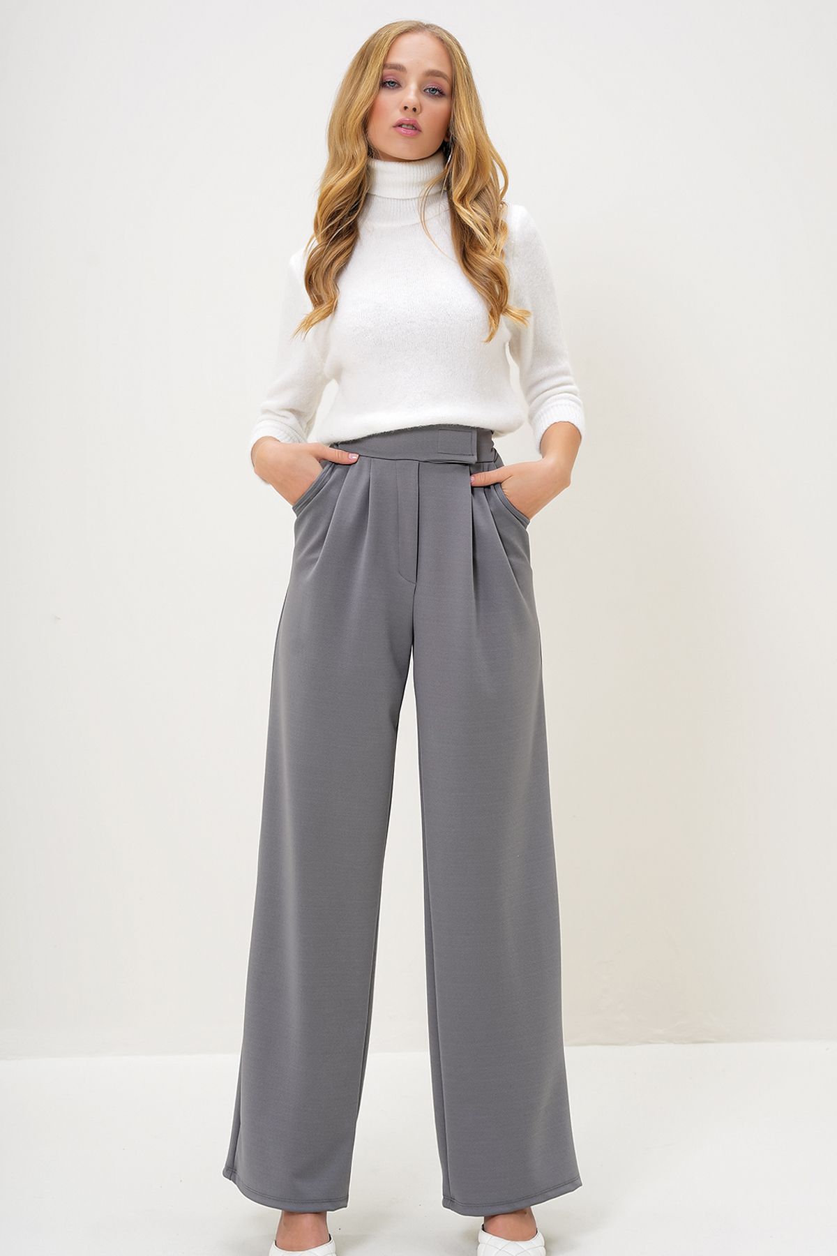 🛍 Trend Alaçatı Stili Kadın Gri Yüksek Bel Çift Cepli Pileli Cırt Kapamalı Palazzo Pantolon ALC-X10753