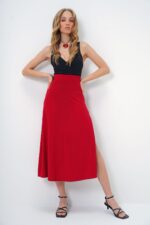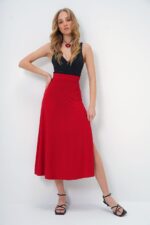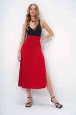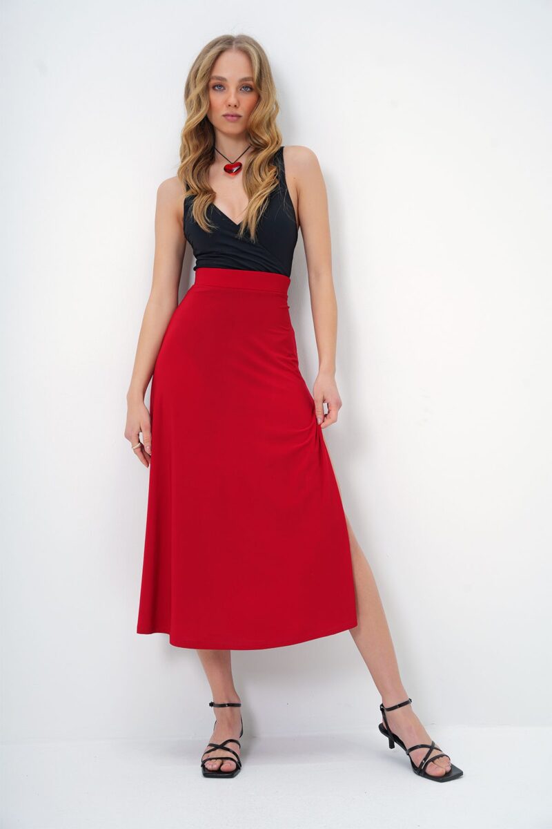 Trend Alaçatı Stili Kadın Kırmızı Beli Lastikli Derin Yırtmaçlı Sandy Kumaş Etek ALC-X13464