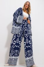 Trend Alaçatı Stili Kadın Lacivert Kimono Ceket Ve Palazzo Pantolon Takım Alc-X11751