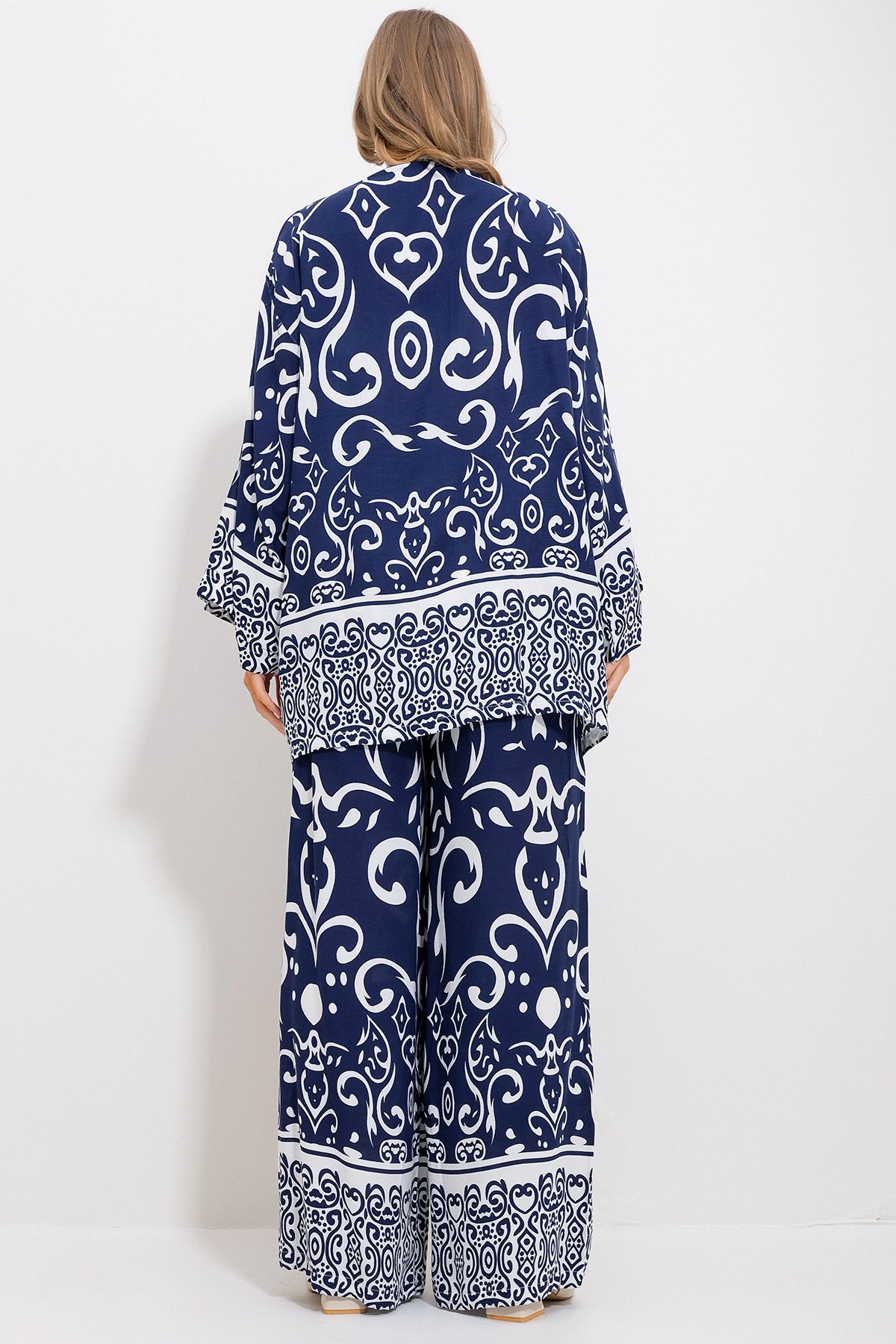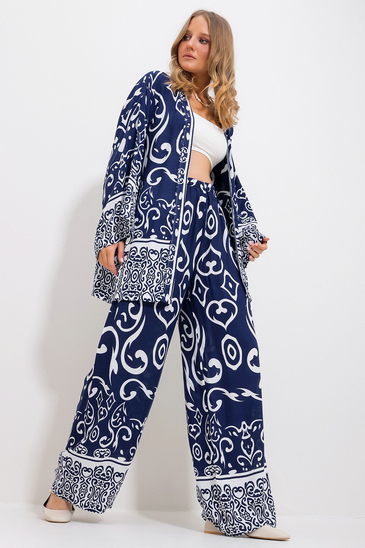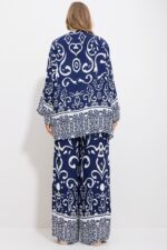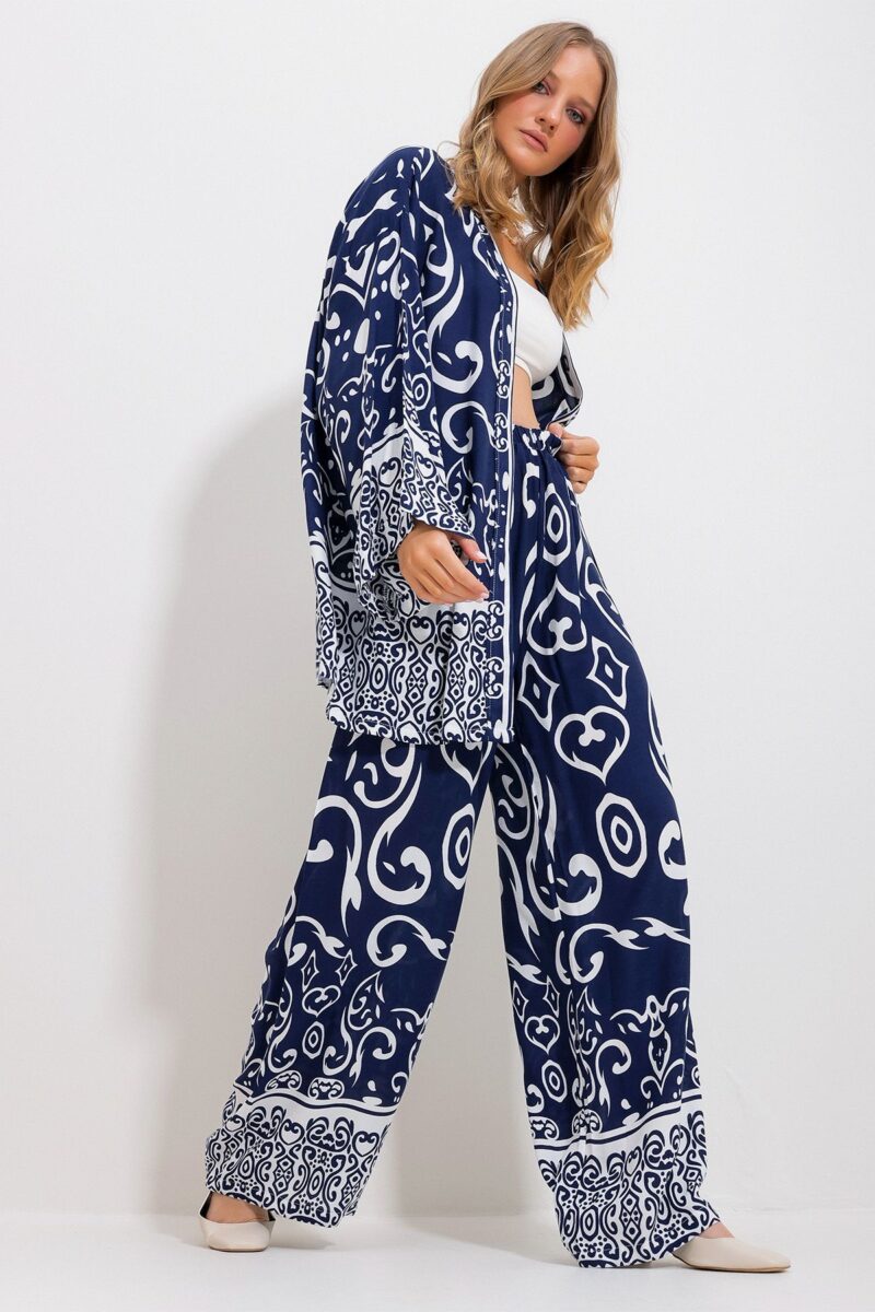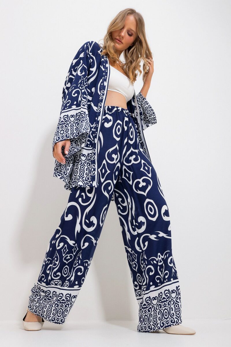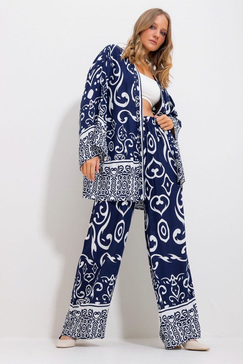 🛍 Trend Alaçatı Stili Kadın Lacivert Kimono Ceket Ve Palazzo Pantolon Takım Alc-X11751