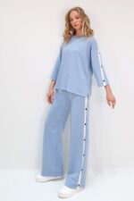 🛍 Trend Alaçatı Stili Kadın Mavi Bisiklet Yaka Çıtçıt Kapamalı İki İplik Eşofman Takım ALC-X13486