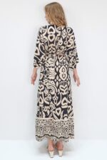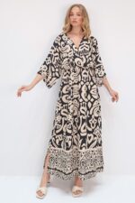Trend Alaçatı Stili Kadın Siyah-Bej Kruvaze Yaka Desenli Dokuma Viskon Elbise ALC-X13734