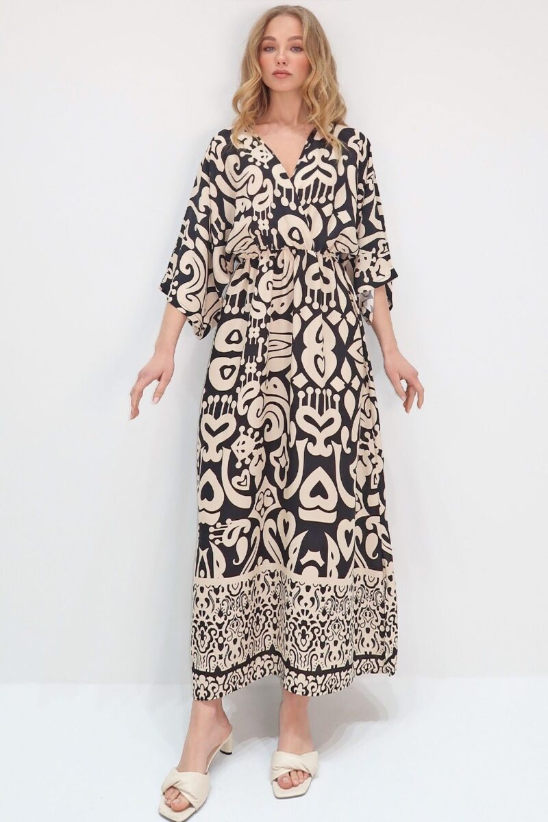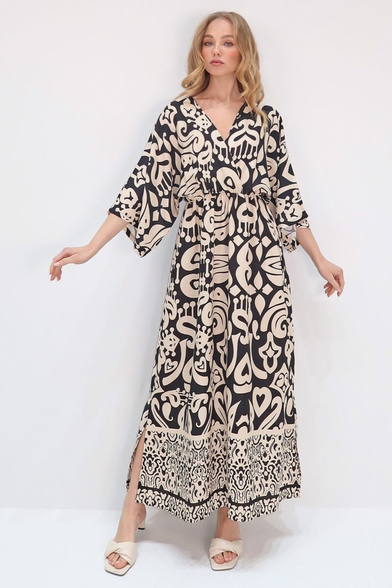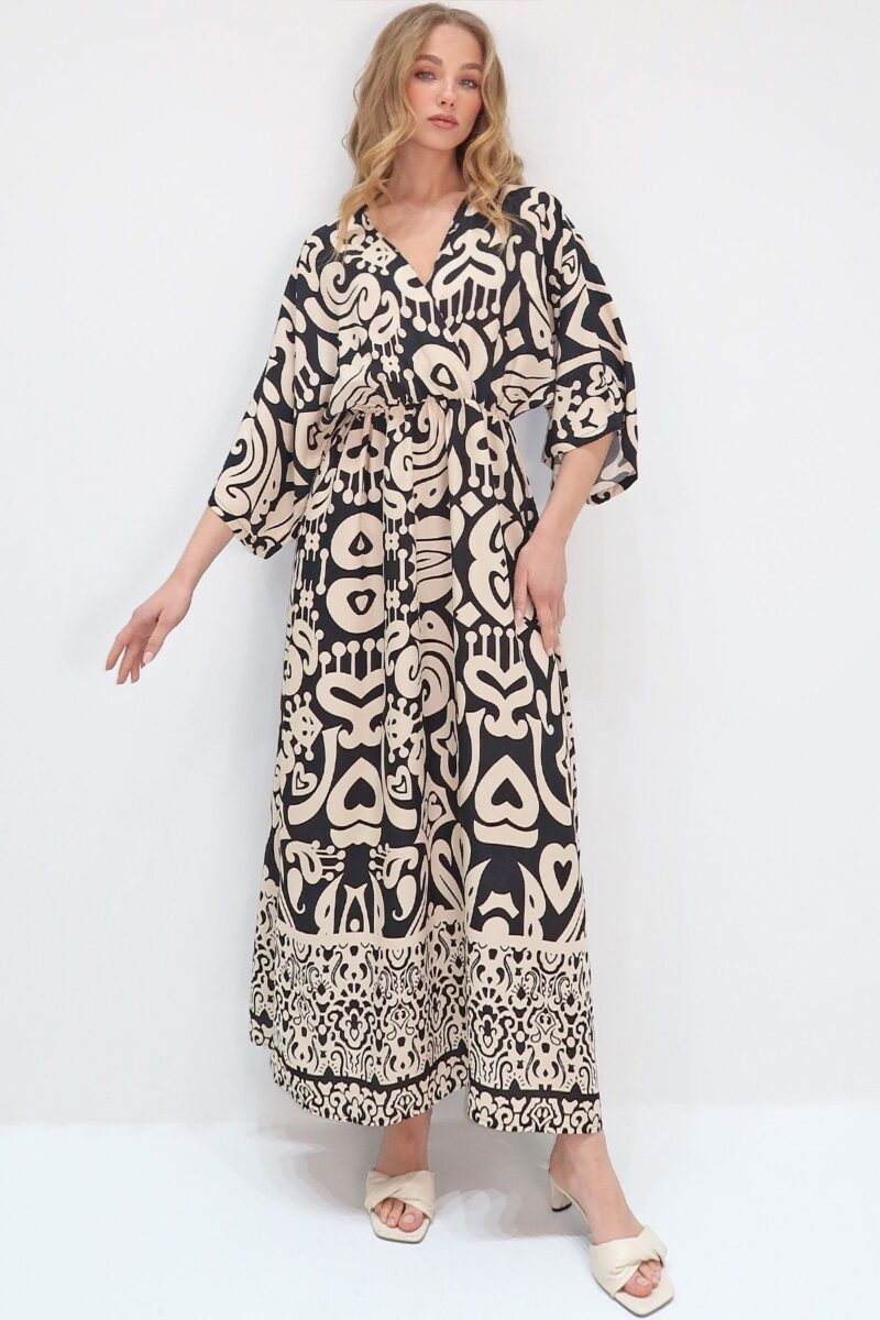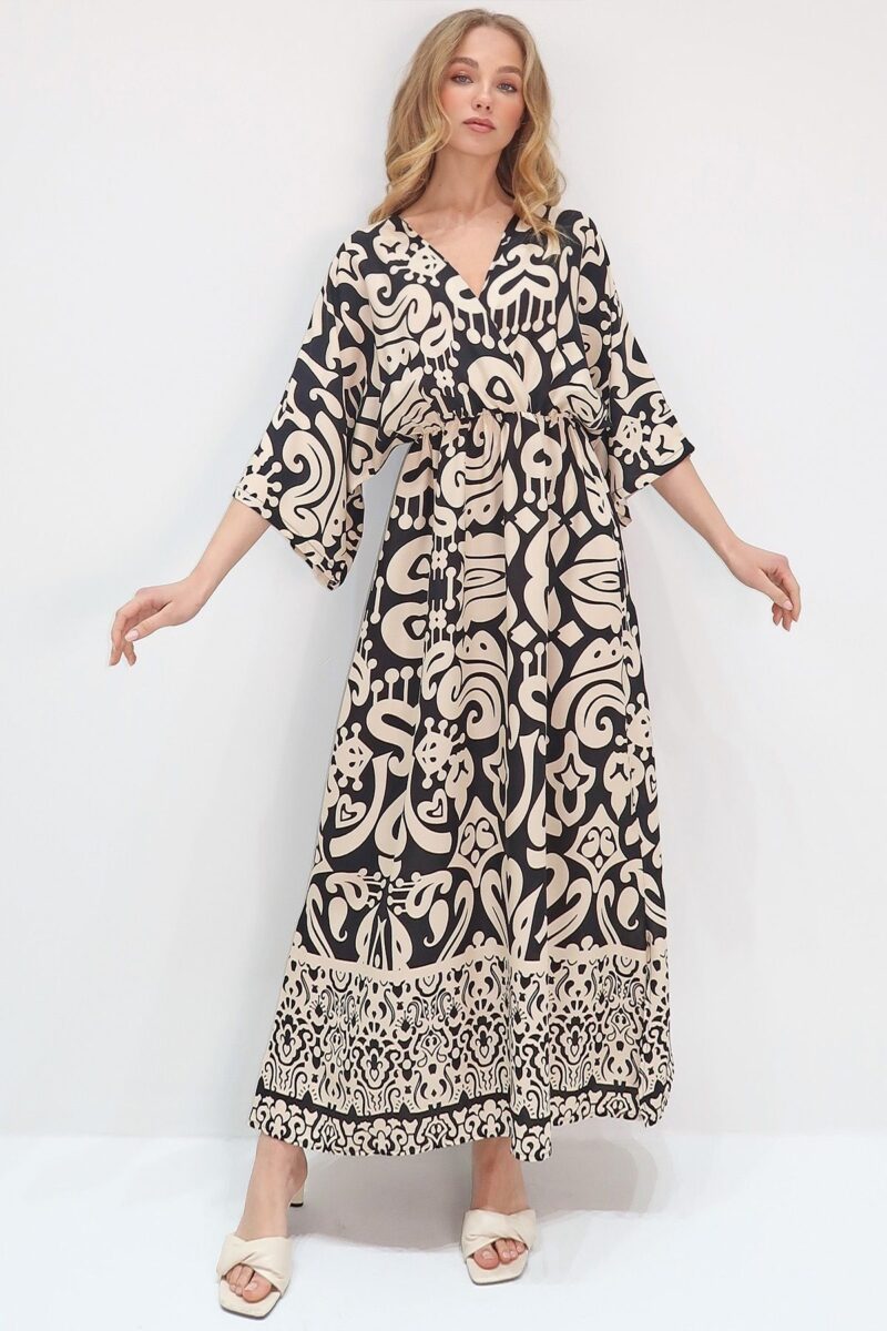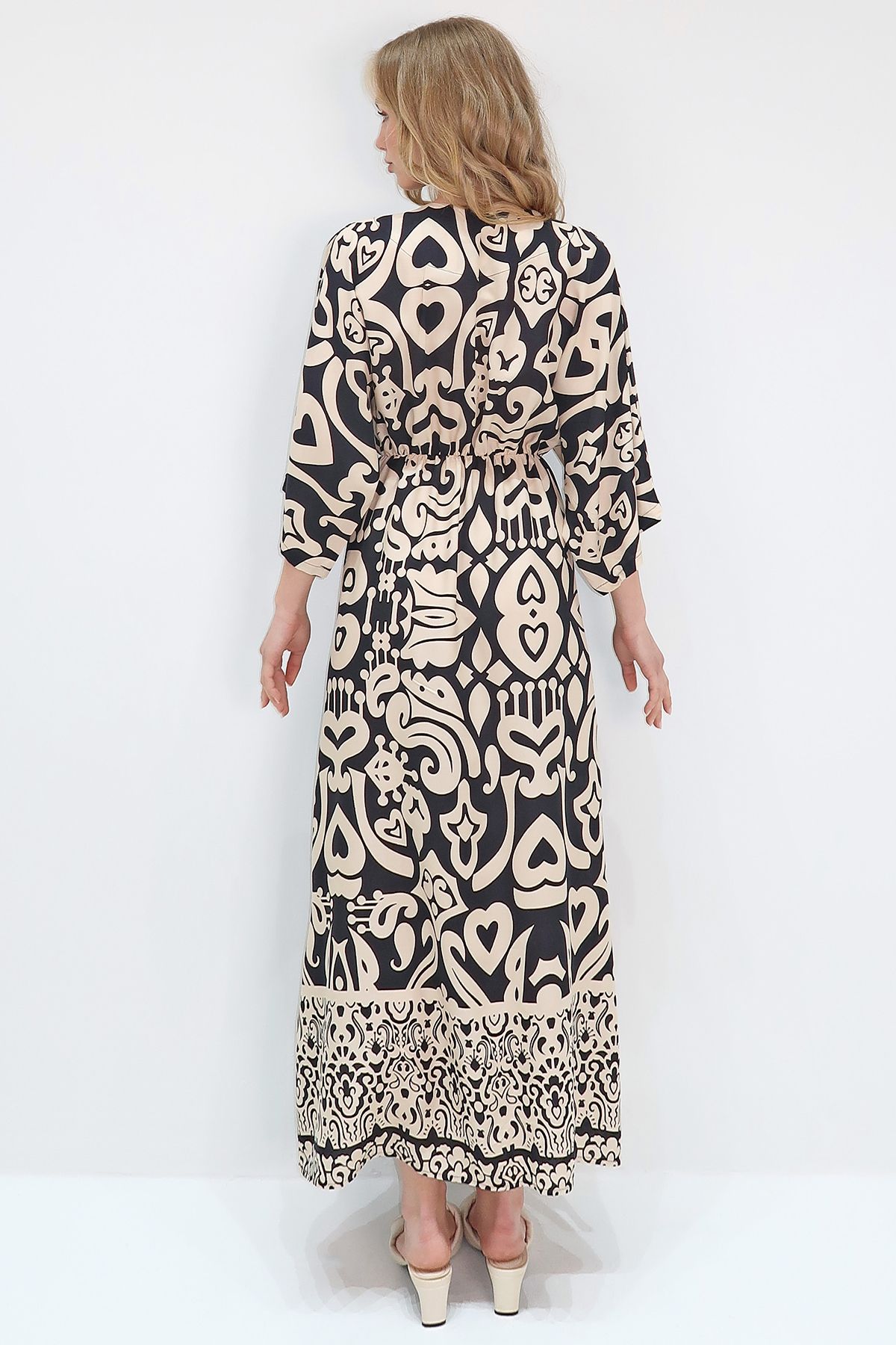 🛍 Trend Alaçatı Stili Kadın Siyah-Bej Kruvaze Yaka Desenli Dokuma Viskon Elbise ALC-X13734