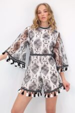 Trend Alaçatı Stili Kadın Siyah-Beyaz Dik Yaka Sırt Dekolteli İçi Astarlı Püskül Detaylı Tül Tulum ALC-X13650