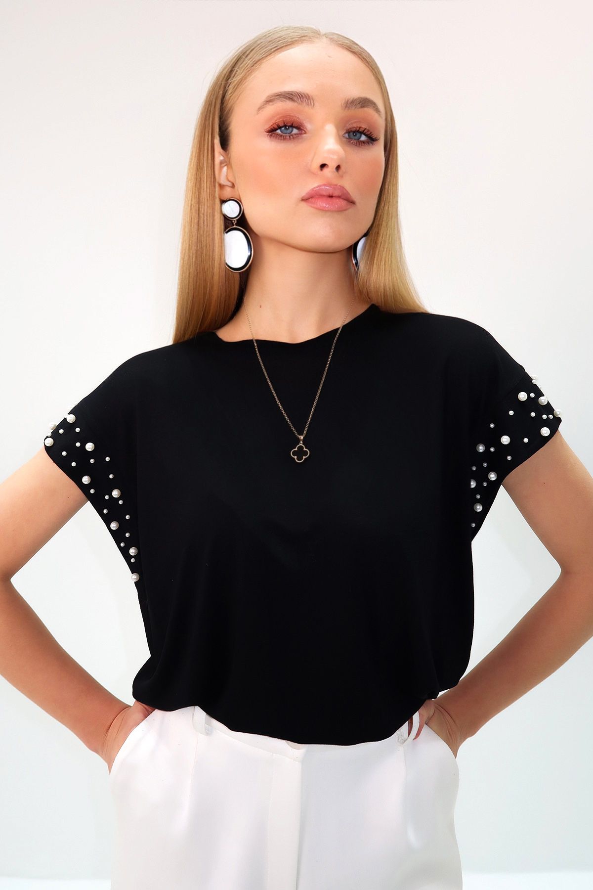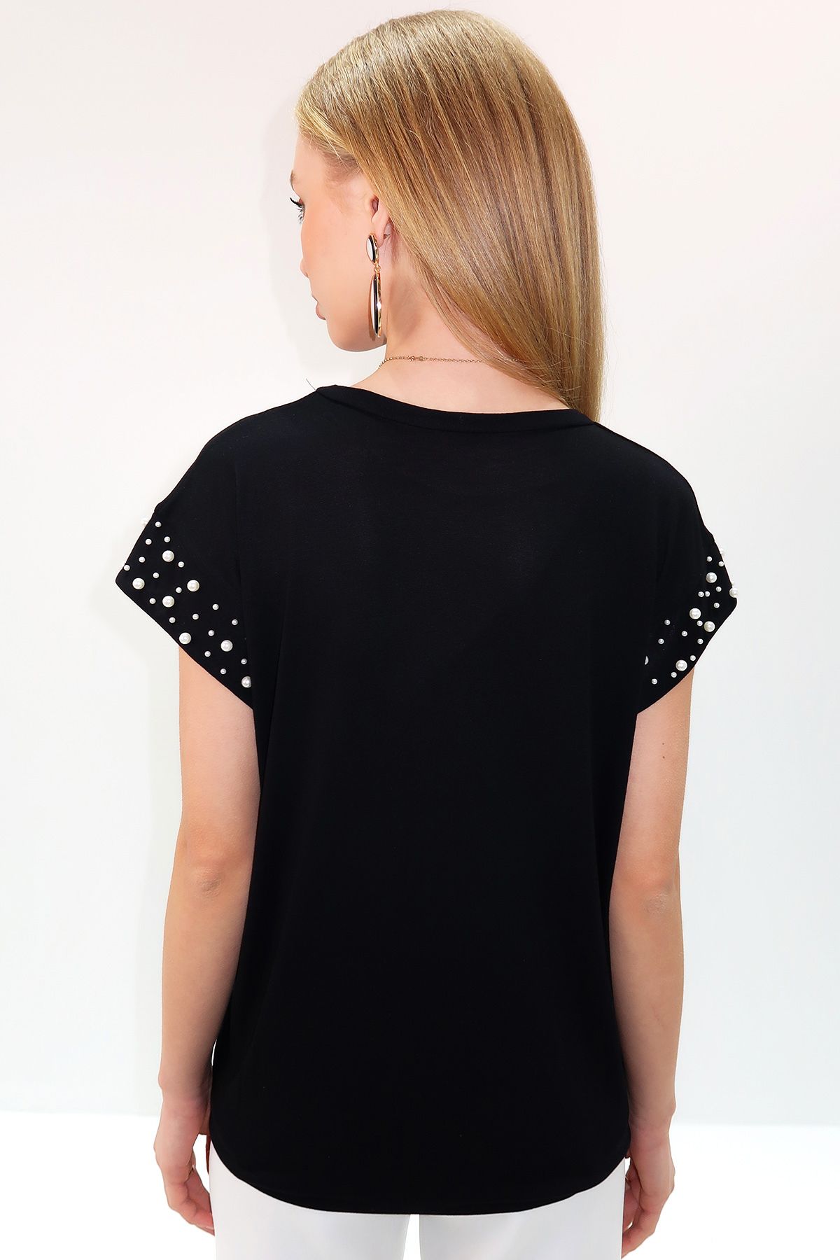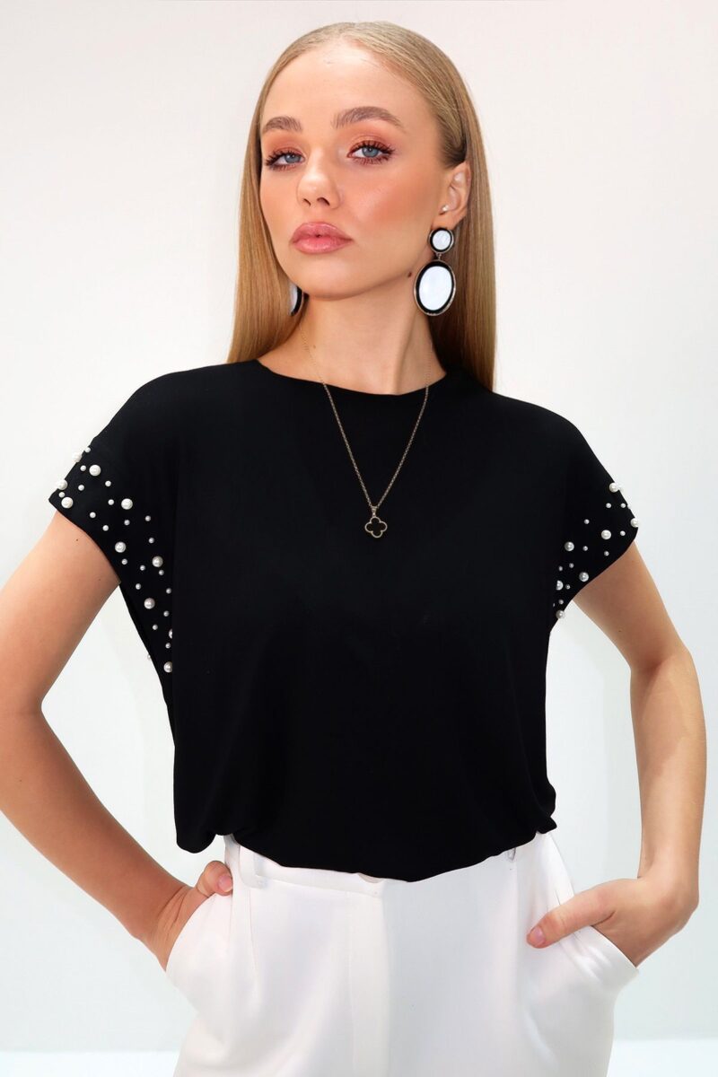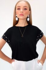 🛍 Trend Alaçatı Stili Kadın Siyah Bisiklet Yaka İnci Çakımlı Kolsuz Sandy Bluz ALC-X13522