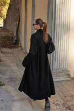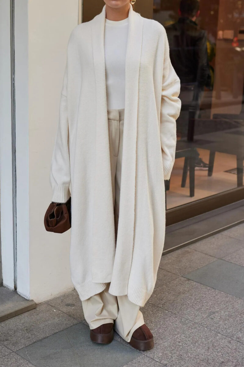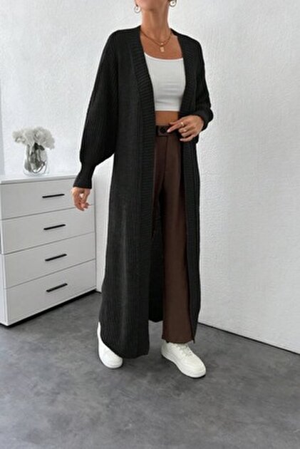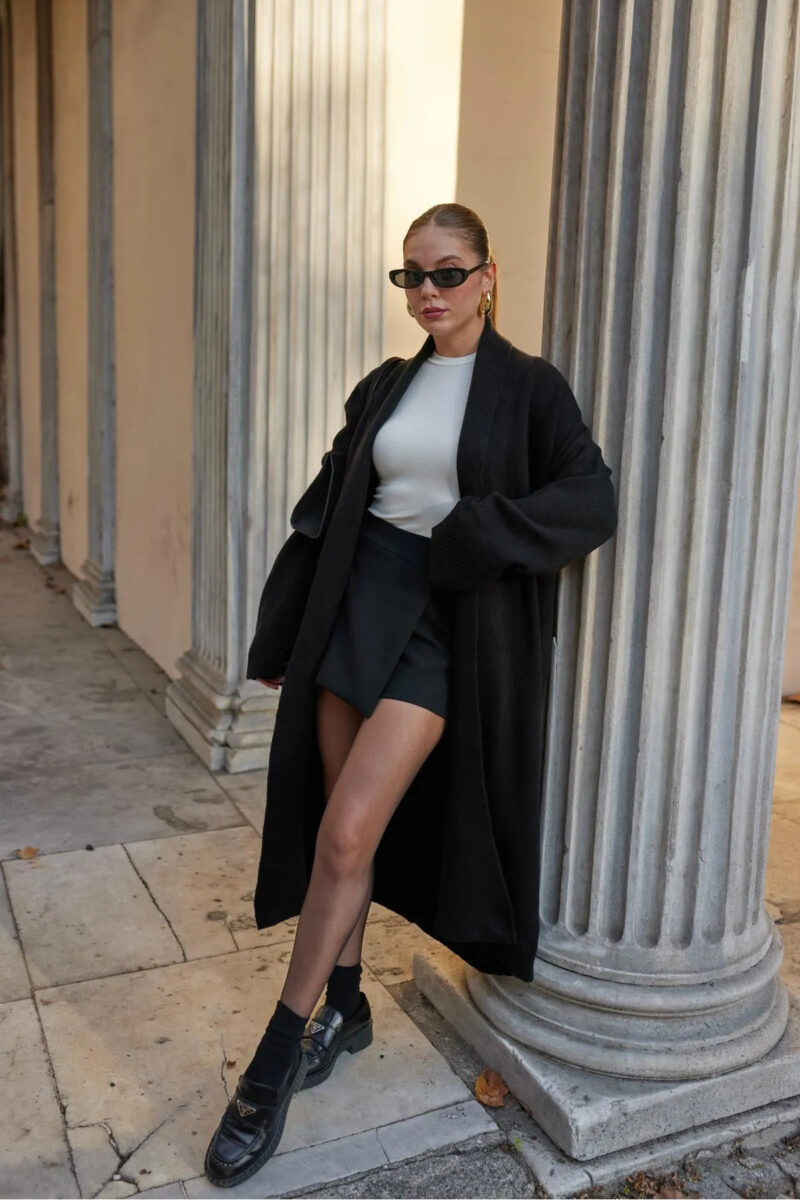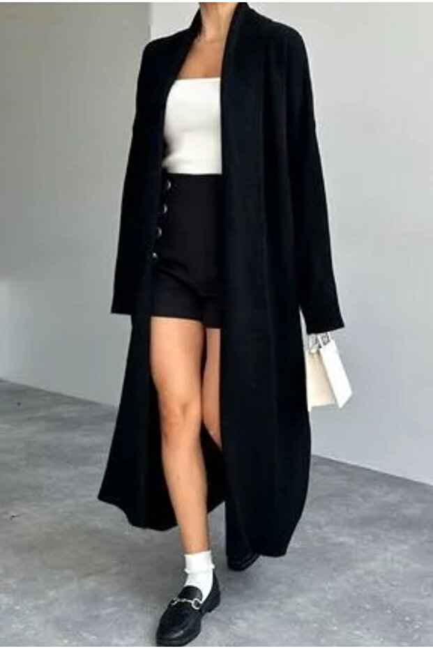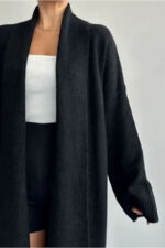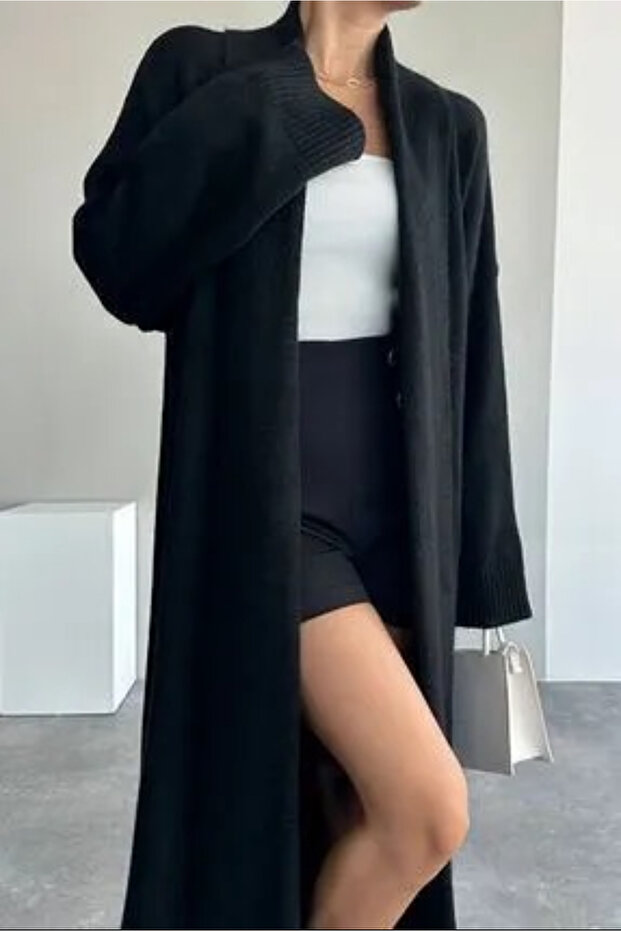 Vaveyla Kadın Siyah Şal Yaka Uzun Triko Hırka | Oversize & Rahat Model